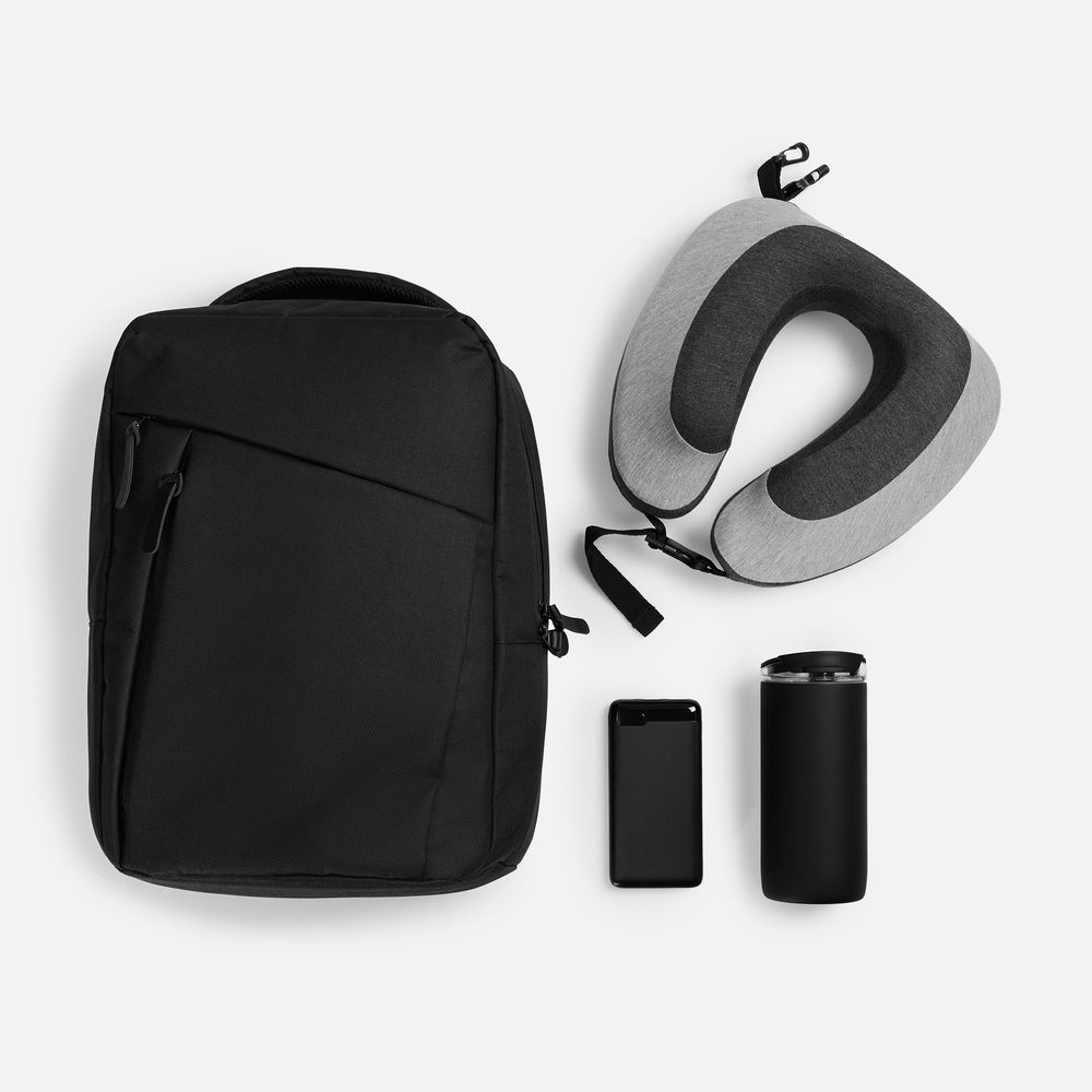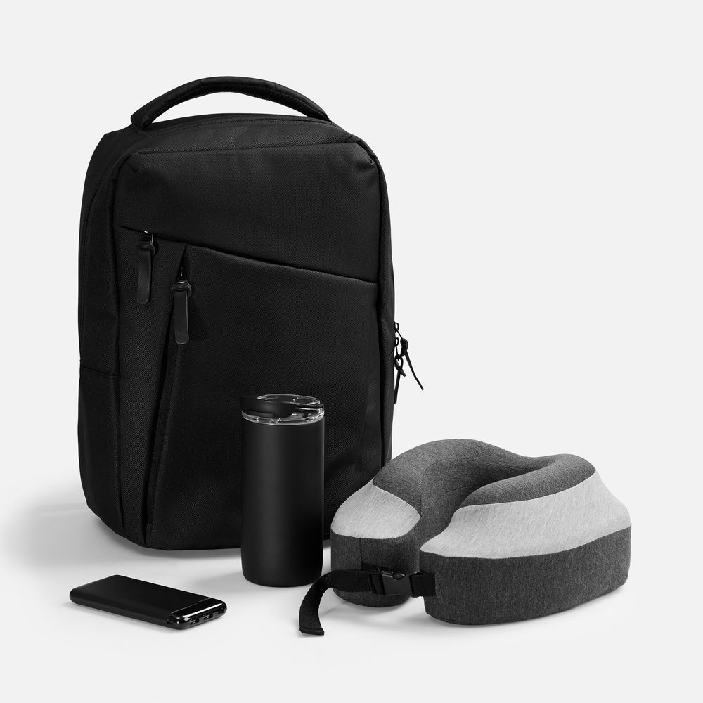 Этот стильный комплект включает в себя все необходимое для комфортных путешествий: практичный рюкзак, мощный внешний аккумулятор, уютную дорожную подушку и термостакан, который сохранит напитки горячими или холодными в любое время.