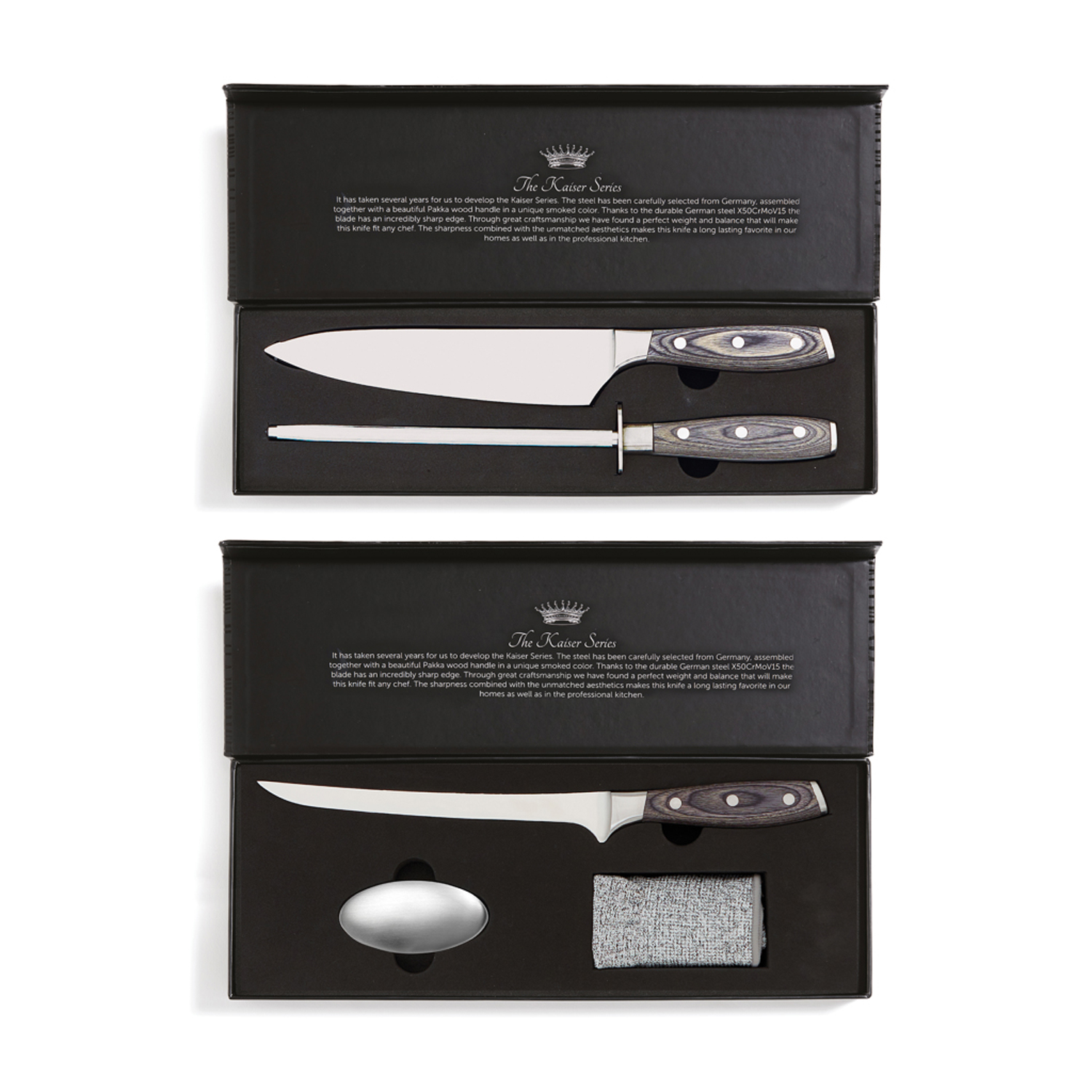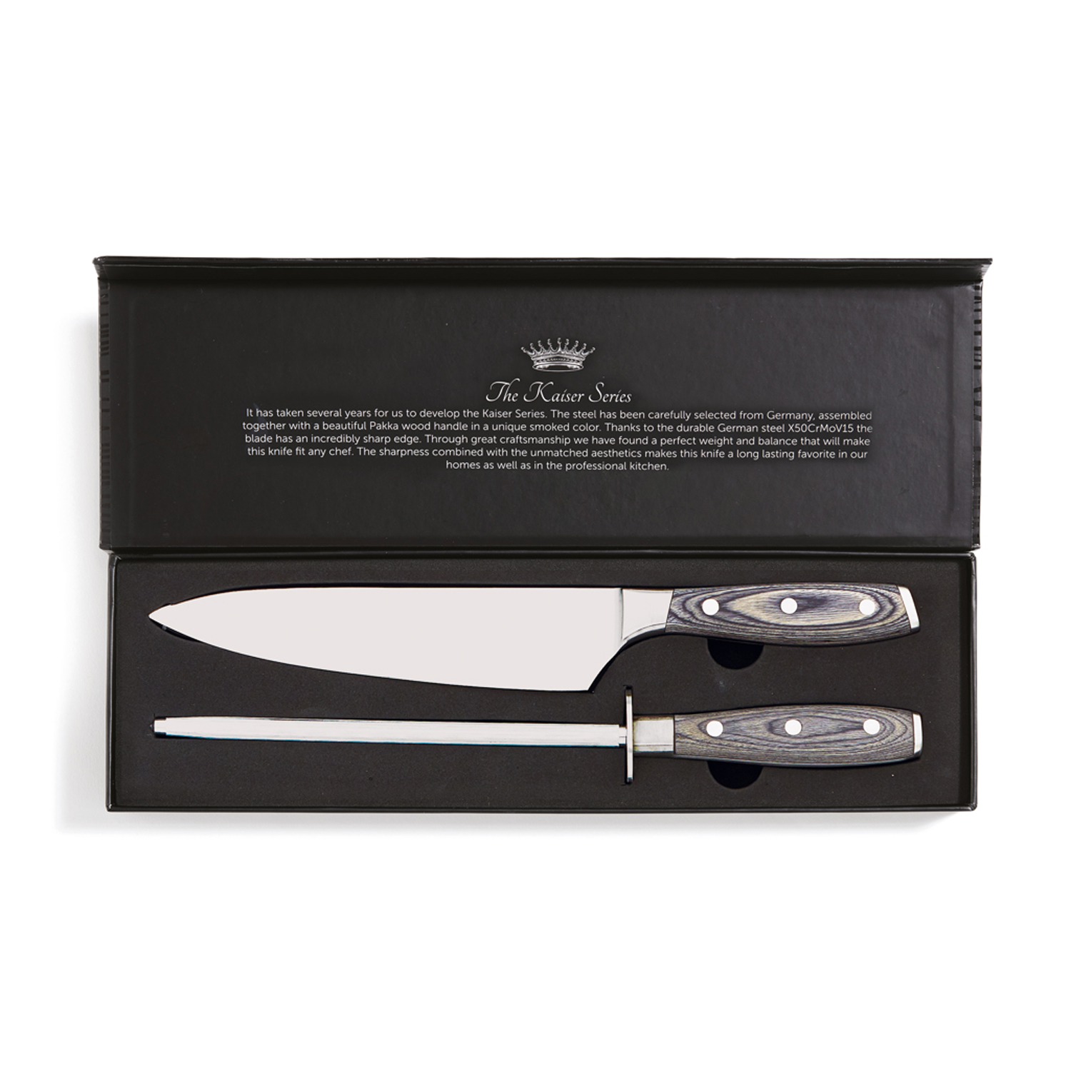Почувствуйте себя настоящим шеф-поваром с набором из серии Kaiser! Он состоит из точилки и кухонного ножа, изготовленных из немецкой нержавеющей стали. Их ручки сделаны из паккавуда — это материал, состоящий из древесины ценных пород и смолы. Так называемая ламинированная древесина получается очень прочной и долговечной, не скользит в руке, не впитывает запахи и не поддается влаге. Сталь устойчива к повреждениям и неприхотлива в уходе: достаточно лишь периодически затачивать нож, и он прослужит вам долгие годы.