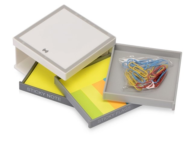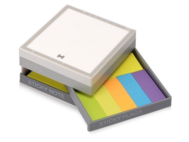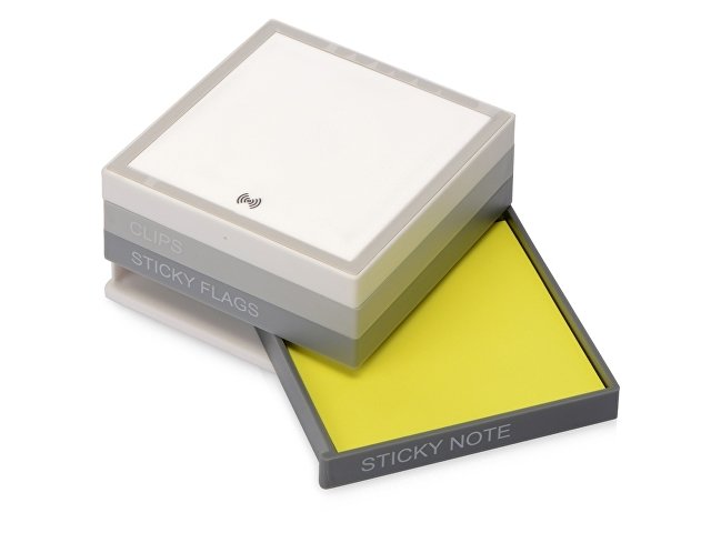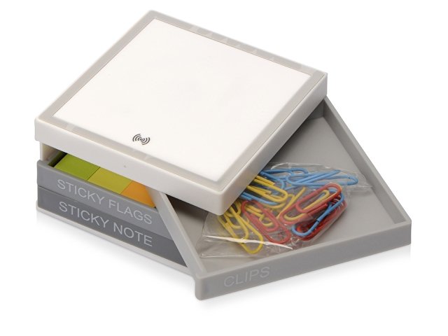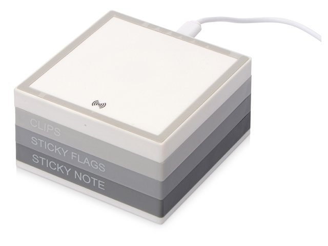 Органайзер Chaos с функцией беспроводной зарядки – современный бизнес-подарок, объединяющий в себе функциональность и современный подход к организации рабочего пространства. Три выдвигающиеся подставки уже содержат скрепки, самоклеящиеся стикеры и стикеры-закладки. Органайзер подходит для беспроводной зарядки и хранения смартфона, поддерживающего функцию беспроводной зарядки, и различных канцелярских аксессуаров. Работает от кабеля Micro-USB. В комплект входит кабель Micro-USB. Тампопечать (1 цвет (белые изделия)) на данный товар осуществляется бесплатно. Оплачивается только настройка оборудования в размере 4500 рублей на весь тираж.