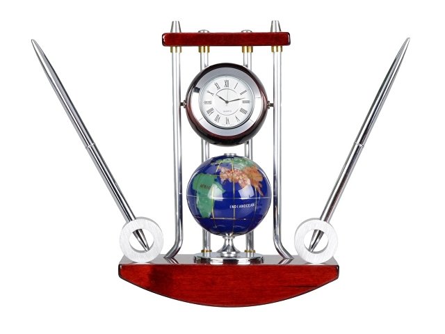 Строгие линии и формы, качественные материалы – это все говорит о продукте представительского класса. Настольный прибор состоит из точных часов, модели глобуса и двух ручек на подставке. На корпус прибора можно нанести гравировку. Гравировка (оптоволоконный лазер) (Без чернения) на данный товар осуществляется бесплатно. Оплачивается только настройка оборудования в размере 1100 рублей на весь тираж.