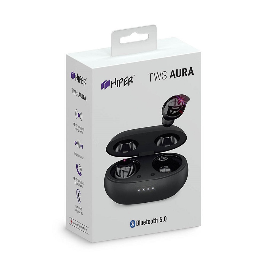 Полностью беспроводная гарнитура (TWS - true wireless stereo) с сенсорным управлением и хорошей эргономикой. HIPER TWS Aura яркая недорогая стерео TWS гарнитура. Качество за разумные деньги. К особенностям модели можно отнести: Сбалансированный чистый звук. Несмотря на невысокую стоимость, гарнитуру отличает чистота звучания во всем звуковом диапазоне. Она подойдет для большинства музыкальных направлений. Время работы гарнитуры 3 часа. Продолжительное время работы в сочетании с быстрым восстановлением заряда от чехла-аккумулятора, позволят вам по-настоящему долго наслаждаться любимой музыкой. Русскоговорящее меню. Все голосовые оповещения на русском языке. Стильный внешний вид. Сочетание глянца в верхней части с soft-touch покрытием внутренней части наушника придает данной гарнитуре изысканности. Удобные многофункциональные кнопки. Удобно управлять гарнитурой, не доставая из кармана телефон. Новая версия Bluetooth 5.0 – отличается энергоэффективностью и помехозащищённостью. Степень пыле и влагозащиты - IP54. Позволит не бояться капризов погоды, вы сможете наслаждаться музыкой в любую погоду. Спецификация: Версия Bluetooth: v.5.0, радиус действия 10 м