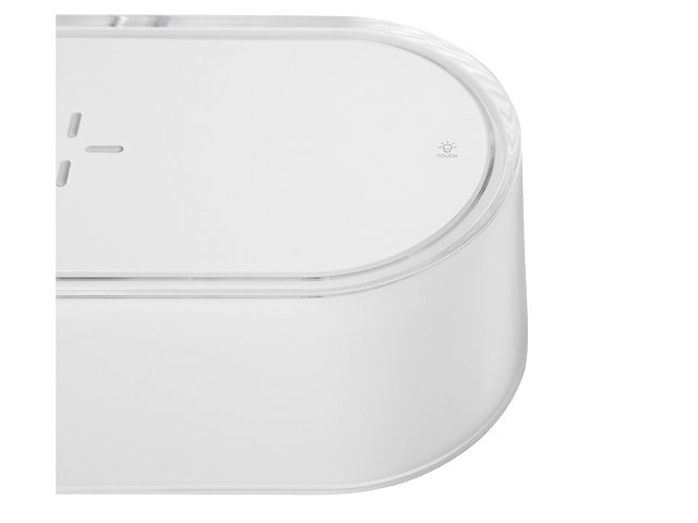 Ночник с RGB-подсветкой из 7 переливающихся цветов. Также есть режимы стандартного и яркого освещения теплым светом. Ночник выполняет функцию зарядной станции для устройств, поддерживающих беспроводную зарядку стандарта Qi мощностью 15 Вт*. Функция ночника работает без подключения к сети благодаря встроенному аккумулятору на 400 мАч. Функция беспроводной зарядки работает только при питании от сети. Устройство можно брендировать методом УФ-печати, тампопечати, а также цифровой печати.