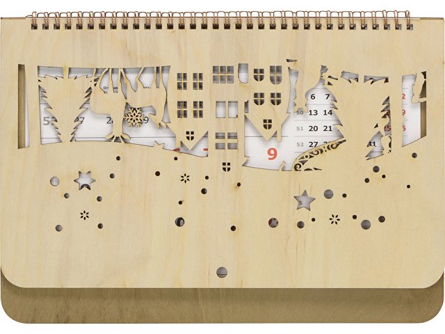 Настенный перекидной календарь имеет необычную обложку, в роли которой выступают фанерные крышки. Нижняя крышка сплошная, верхняя — резная, ажурная, с вырезанным новогодним пейзажем и большим полем под нанесение логотипа или надписи, которая органично впишется в облик календаря.