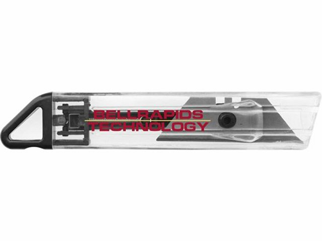 Нож Hoost. Нож с автоматически выдвигающимся лезвием. Тампопечать (1 цвет (цветные изделия)) на данный товар осуществляется бесплатно. Оплачивается только настройка оборудования в размере 4500 рублей на весь тираж.