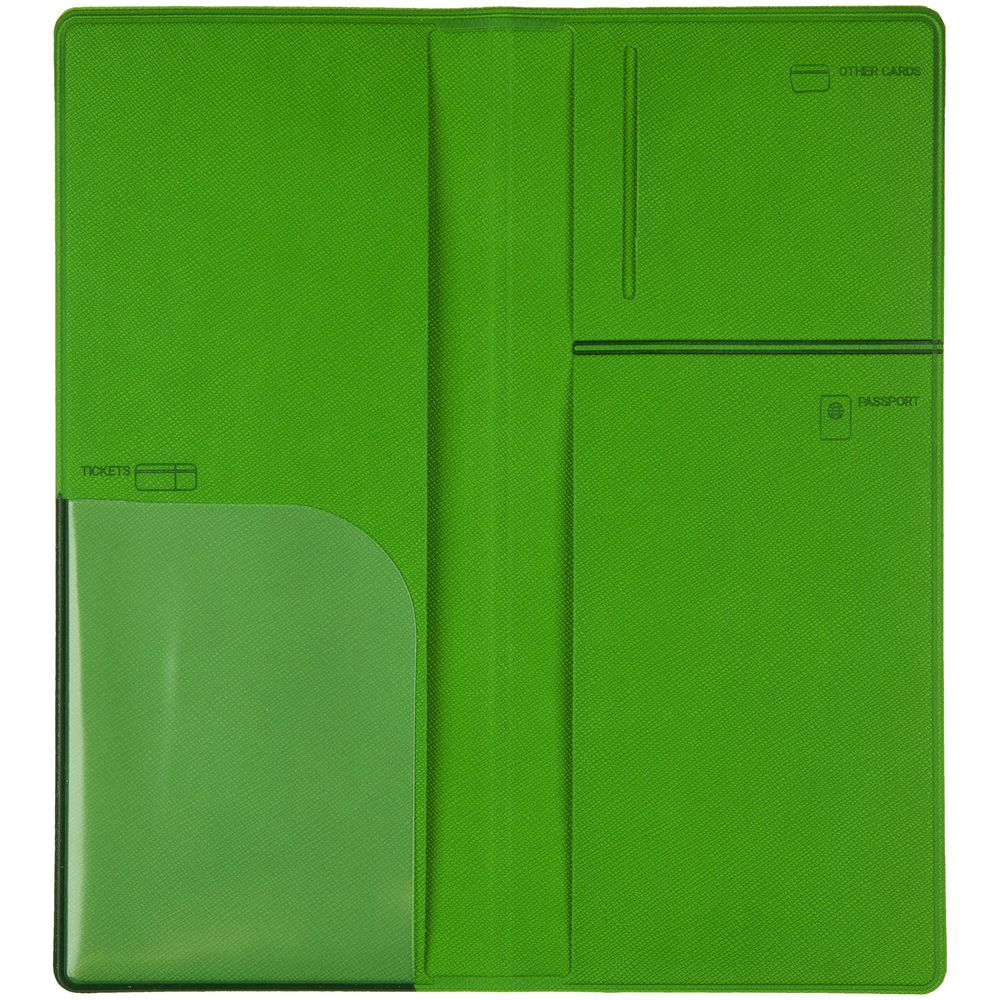 Органайзер из искусственного материала, имитирующего сафьяновую кожу, имеет 5 отделений: для билетов, паспорта, визиток или кредитных карт.