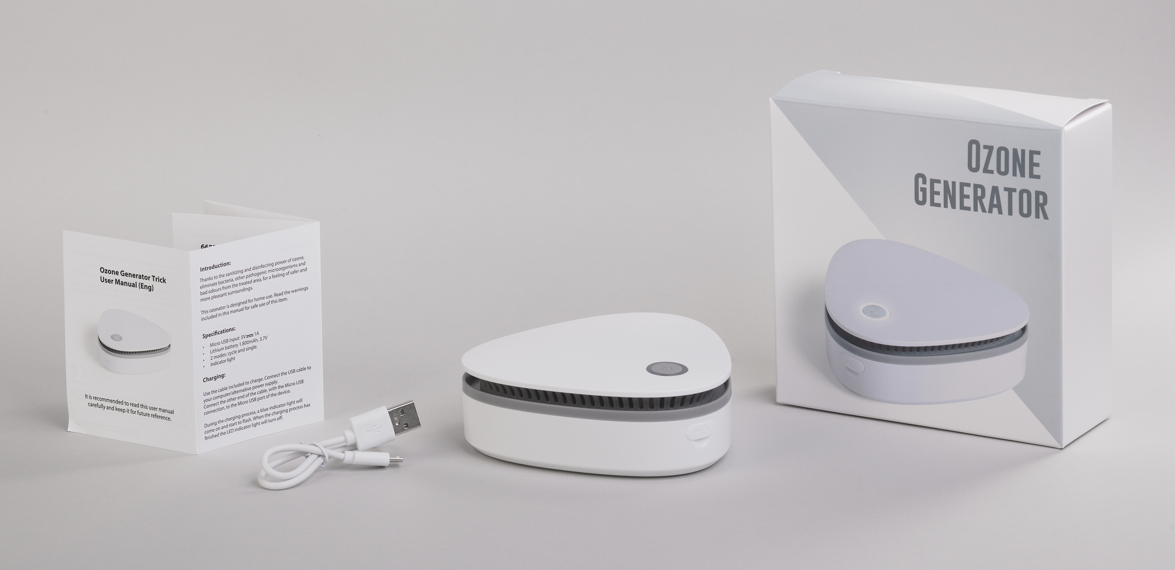 Портативный генератор озона работает от встроенной батареи на 1800 мАч.