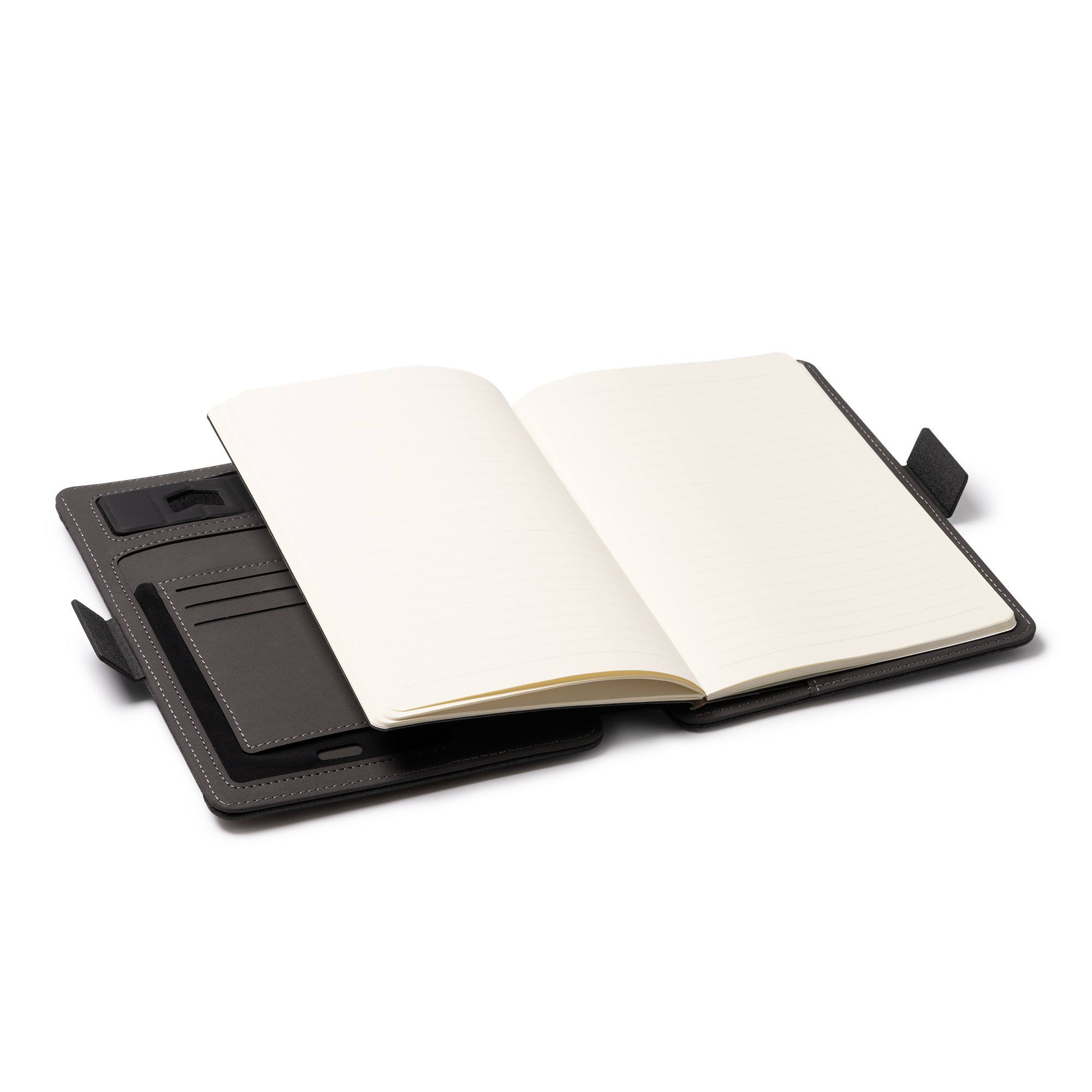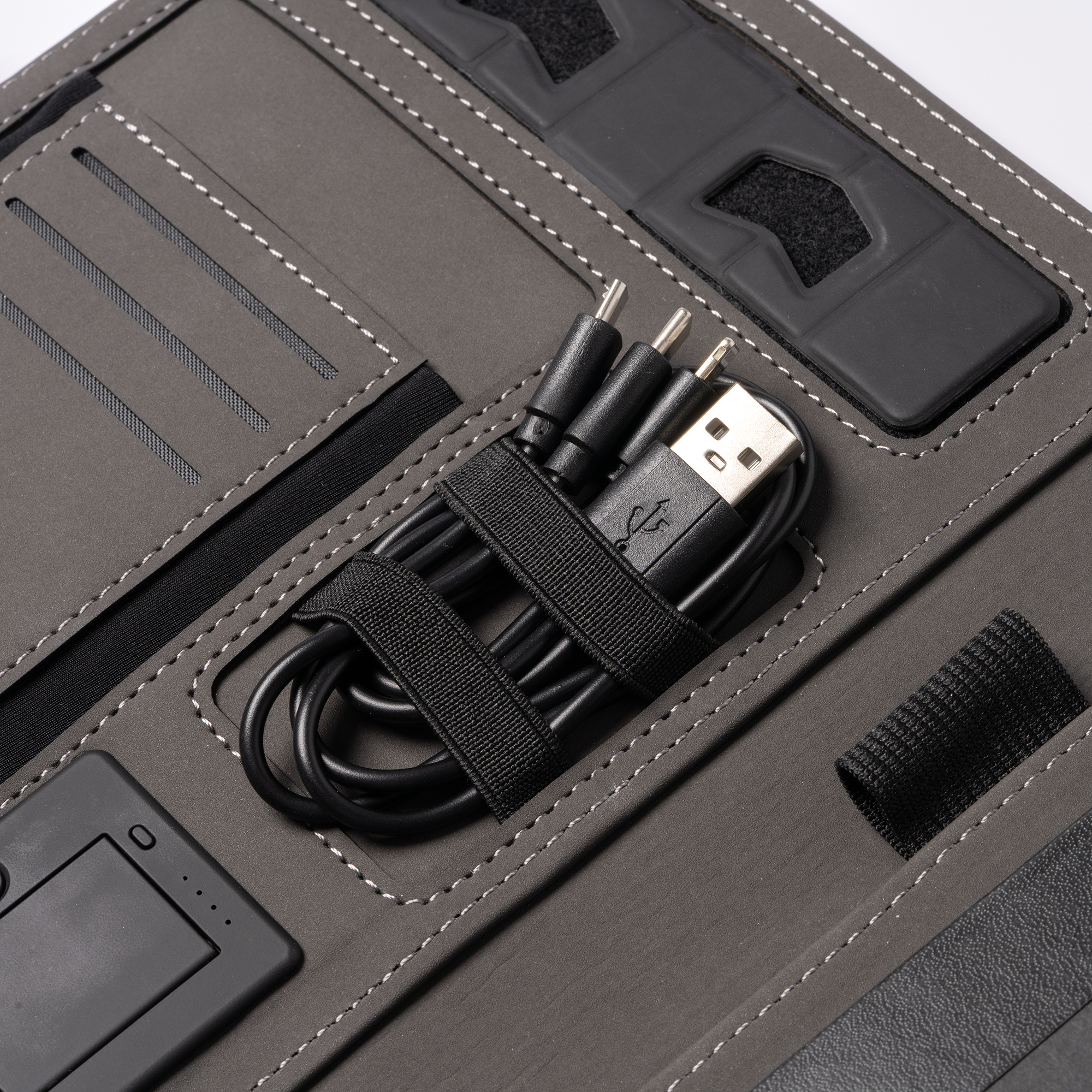 Многофункциональная папка формата А5 RPET 300D — универсальный и практичный аксессуар, позволяющий систематизировать документы. Магнитный замок, беспроводная зарядка, съемный блокнот на 56 листов, кармашек для мобильного, держатель для карт, ручек и мобильного. Кроме того, в комплект входит кабель с 3 входами (тип C и выход USB)