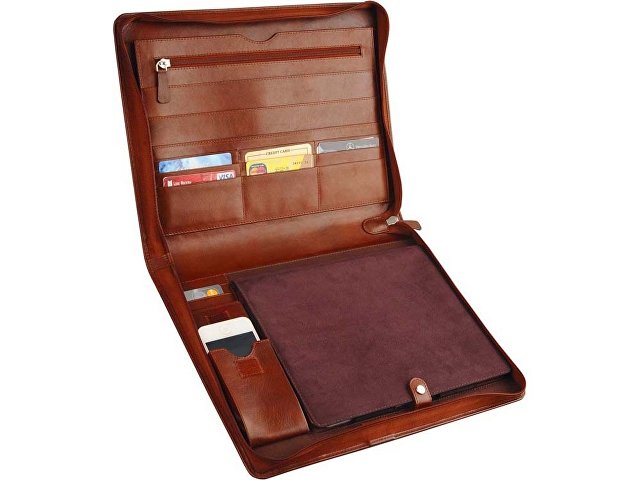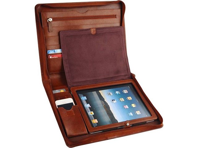Папка уникальна. Мало того, что она из очень хорошей кожи, мало того, что в ней предусмотрено много отделений самых разных назначений, в ней еще есть очень удобное место для iPad 2 / 4 и iPhone. А это ее делает просто бесценной. Тиснение (Блинт) на данный товар осуществляется бесплатно. Оплачивается только настройка оборудования в размере 6200 рублей на весь тираж.