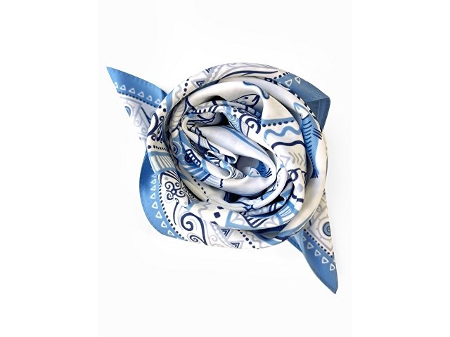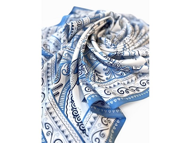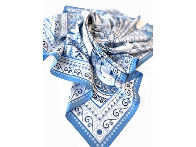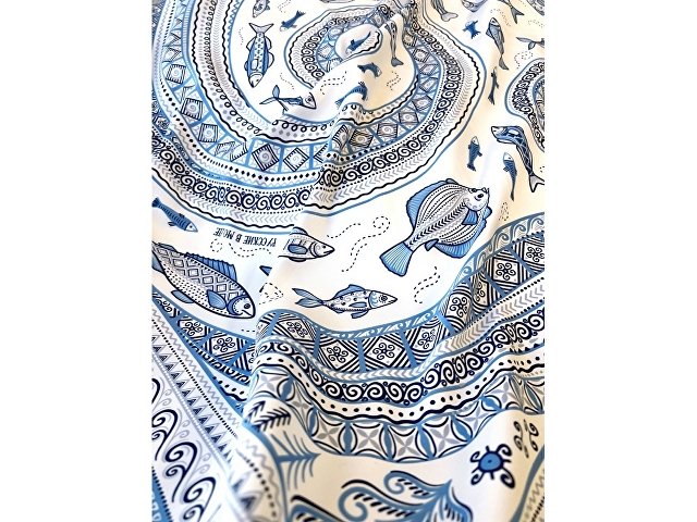 Платок из коллекции бренда Русские в моде посвящён уникальному искусству этой росписи. Изображения спиралевидных орнаментов в виде волн, елочек, рыбок украшают дизайн. Все это означает плодородие стихий земли и воды, энергию солнца, богатство и процветание.