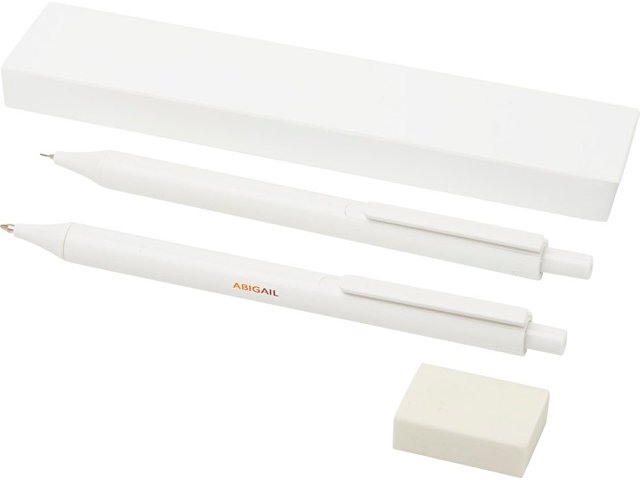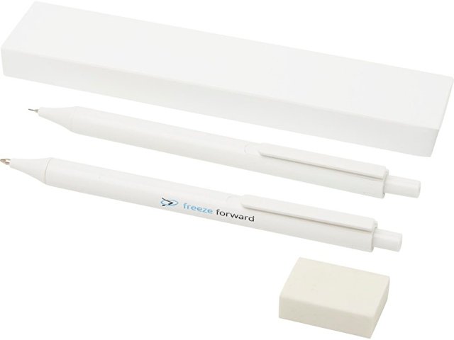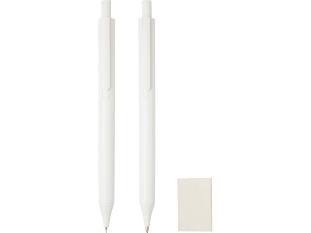 Комплект антибактериальных канцелярских принадлежностей, состоящий из шариковой ручки с нажимным механизмом, механического карандаша и ластика. Нанопорошковая добавка уменьшает рост микроорганизмов на поверхности ручек. Тампопечать (1 цвет (белые изделия)) на данный товар осуществляется бесплатно. Оплачивается только настройка оборудования в размере 4500 рублей на весь тираж.