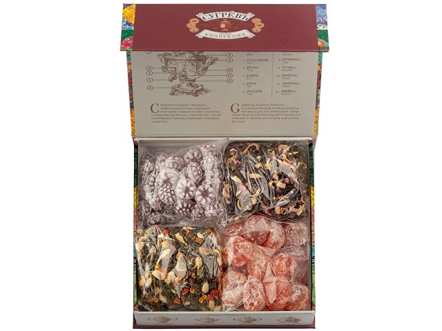 Купажи чая составлены так, чтобы сочетать вкус и аромат отборных сортов китайского и индийского чай с красотой разноцветных лепестков мальвы, лилии, жасмина и акации. В набор также входят монпансье со вкусом чёрной смородины и цукаты из кумквата. Внутри шкатулки находится мини-открытка, которую покупатель может подписать.