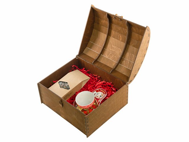 Набор поставляется в большой деревянной коробке в виде сундука с замочком. Цифровая печать (наклейка на белой пленке) на данный товар осуществляется бесплатно. Оплачивается только настройка оборудования в размере 1100 рублей на весь тираж.