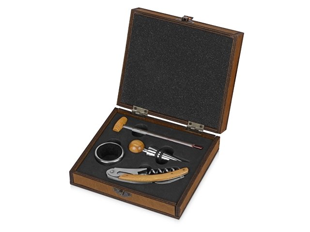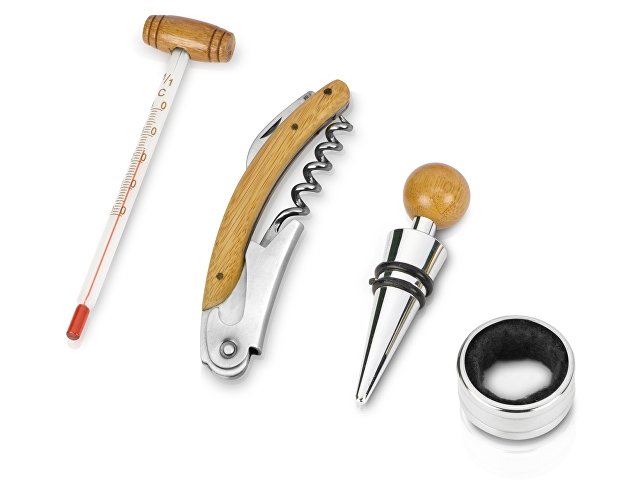 В набор аксессуаров для вина входят штопор-открывалка, воротничок на бутылку, пробка для бутылки и даже термометр. Набор поставляется в презентабельном деревянном футляре. Гравировка (оптоволоконный лазер) (Без чернения) на данный товар осуществляется бесплатно. Оплачивается только настройка оборудования в размере 1100 рублей на весь тираж.
