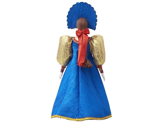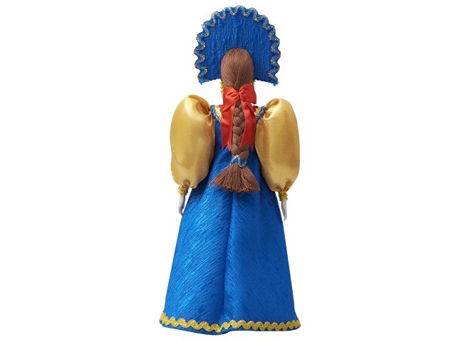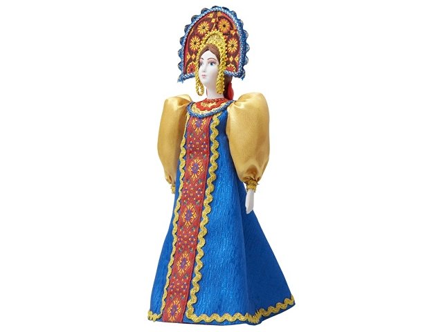 - Фарфоровая кукла в народном костюме: ручная работа, украшенная детализированным голубым сарафаном, воздушными белыми рукавами и нарядным кокошником с узорами. Кукла воплощает эстетику старинных русских праздников.