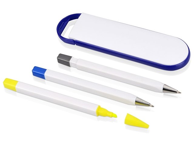 Набор включает в себя шариковую ручку, маркер, карандаш и футляр. Возможность нанесения логотипа на футляр и корпус принадлежностей поможет сделать набор еще ярче. Тампопечать (1 цвет (белые изделия)) на данный товар осуществляется бесплатно. Оплачивается только настройка оборудования в размере 4500 рублей на весь тираж.