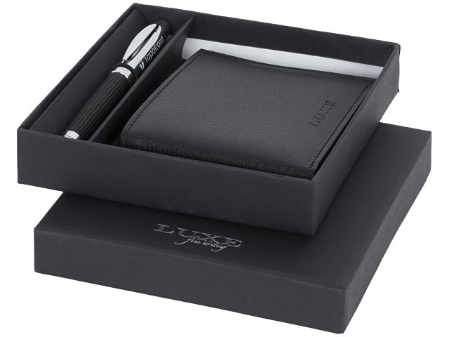 Подарочный набор из шариковой ручки и кошелька. Два необходимых предмета в одном стильном подарочном наборе. Шариковая ручка с кожаным покрытием с бумажником. Эксклюзивный дизайн. Предлагается в подарочной коробке LUXE. Металл и искусственная кожа. Тиснение (Блинт) на данный товар осуществляется бесплатно. Оплачивается только настройка оборудования в размере 6200 рублей на весь тираж.