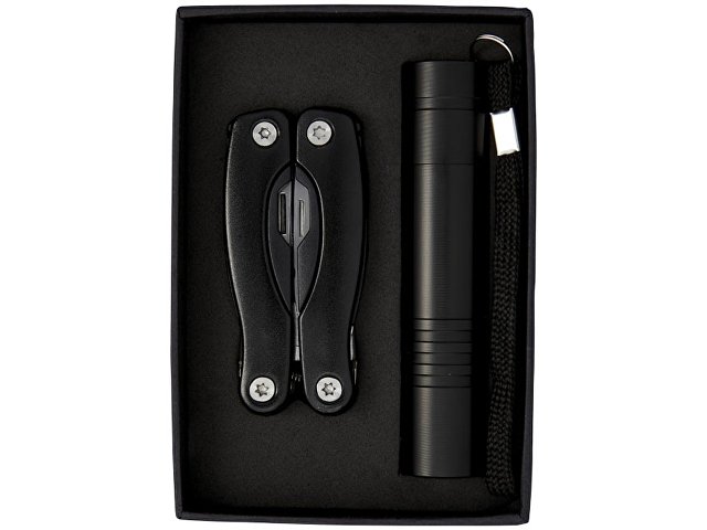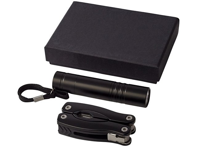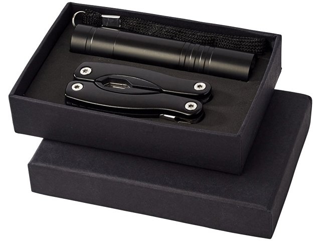Подарочный набор Scout с многофункциональным ножом и фонариком. 11-тифункциональный инструмент с диодным фонариком упакован в черную картонную коробку. Батарейки в комплекте. Алюминий. Гравировка (оптоволоконный лазер) (Без чернения) на данный товар осуществляется бесплатно. Оплачивается только настройка оборудования в размере 1100 рублей на весь тираж.