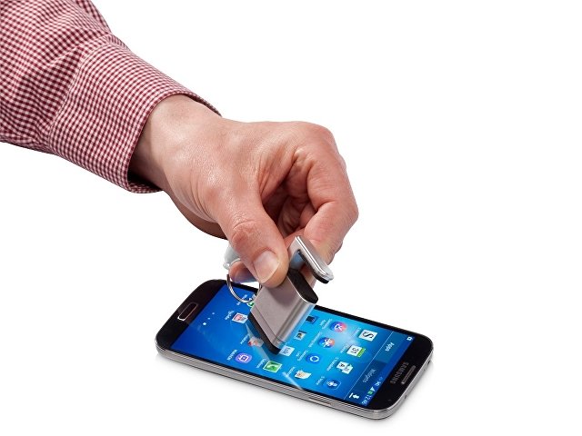 Подставка-брелок для мобильного телефона с губкой для чистки экрана. Функциональный промо-сувенир для продвижения цифровых устройств с сенсорным экраном: мобильных телефонов, планшетов, фотоаппаратов и т.д. Различные расцветки. Возможно нанесение изображения по вашему эскизу. Тампопечать (1 цвет (белые изделия)) на данный товар осуществляется бесплатно. Оплачивается только настройка оборудования в размере 4500 рублей на весь тираж.
