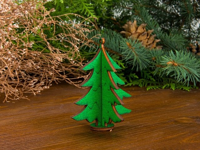 Елочная экоигрушка в виде главного новогоднего дерева – атмосферный и праздничный сувенир. Елочка изготовлена из березовой фанеры и тонирована в зелёный цвет. Этот небольшой новогодний презент отлично укладывается в концепцию экоподарка, при производстве и тонировании используются натуральные материалы и красители.