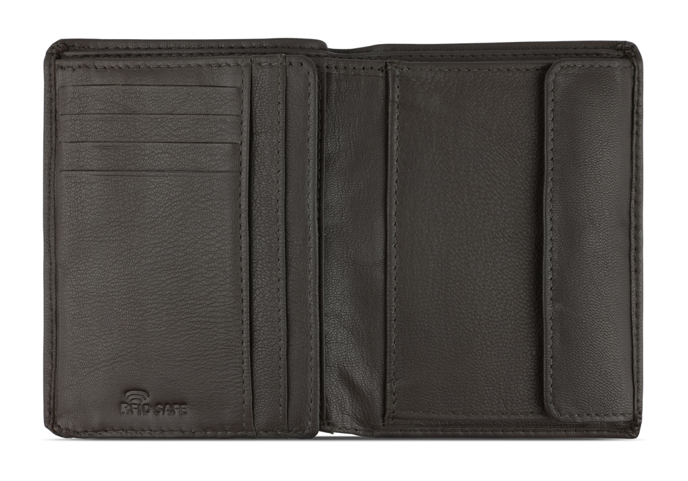 Функциональная организация: 2 отделения для банкнот, 8 слотов для карт, 6 карманов, отделение для монет, сетчатый карман, защита данных RFID.