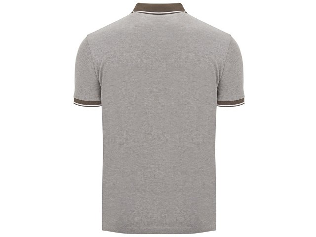 Рубашка поло с коротким рукавом. Манжеты и воротник из однотонного риба 1х1 с контрастными полосками. Планка на 3 пуговицы. Низ с боковыми разрезами, отделанными тесьмой. Спинка немного длиннее полочки. Полотно с меланжевым эффектом.