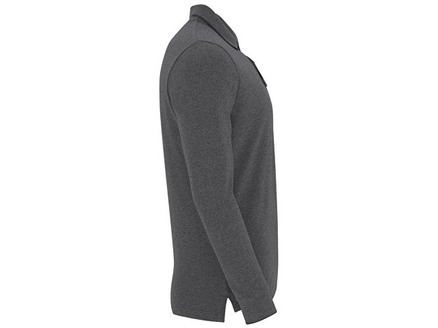 Поло с длинным рукавом из полотна с меланжевым эффектом. Планка с двумя пуговицами. Однотонная полоска по воротнику и манжетам. Разрезы в боковых швах отделаны контрастной тесьмой. Спинка длиннее полочки.