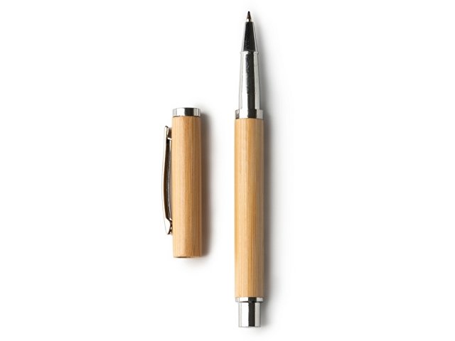 Ручка-роллер с корпусом из бамбука и металлическими деталями. Синие чернила
