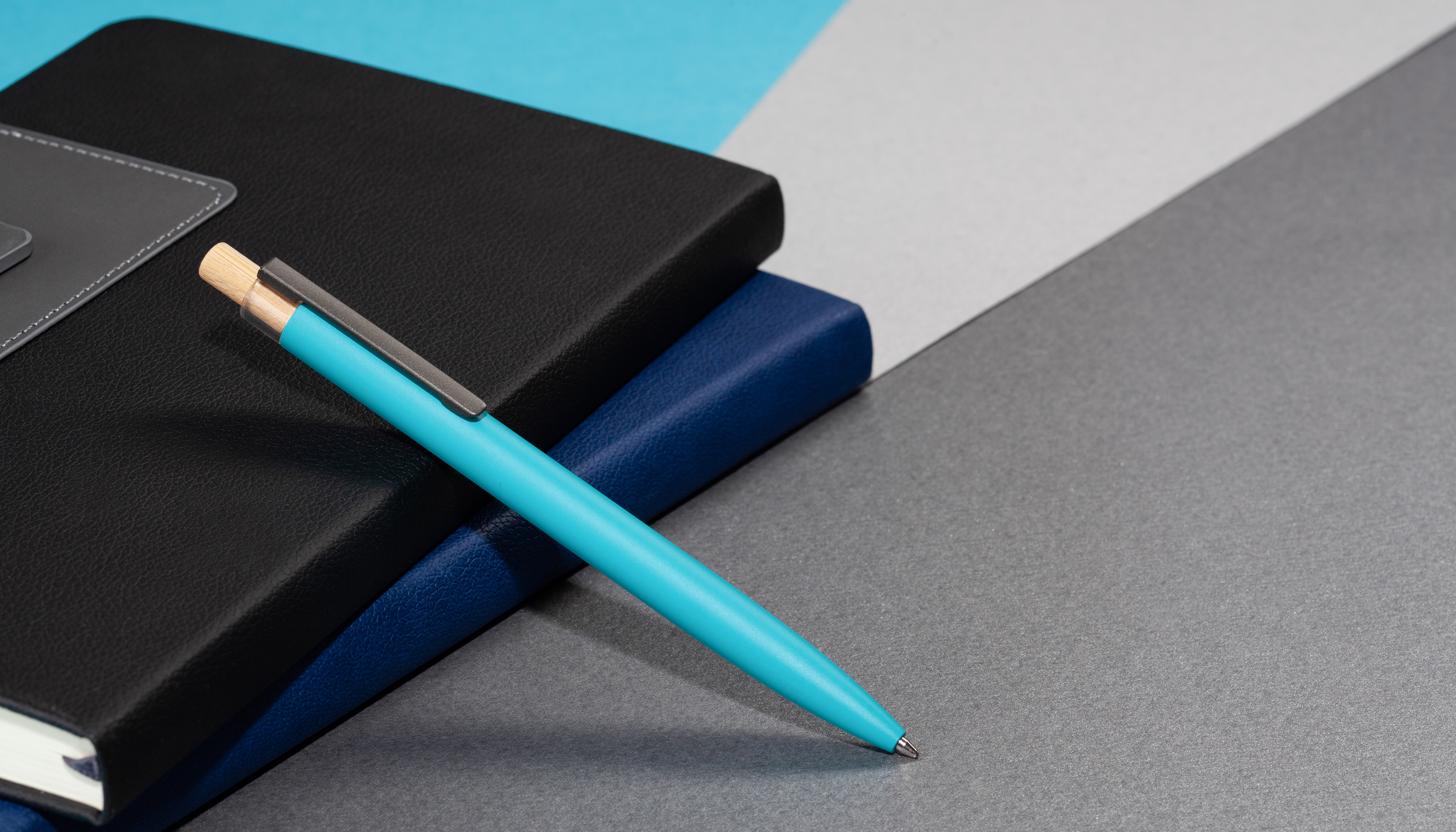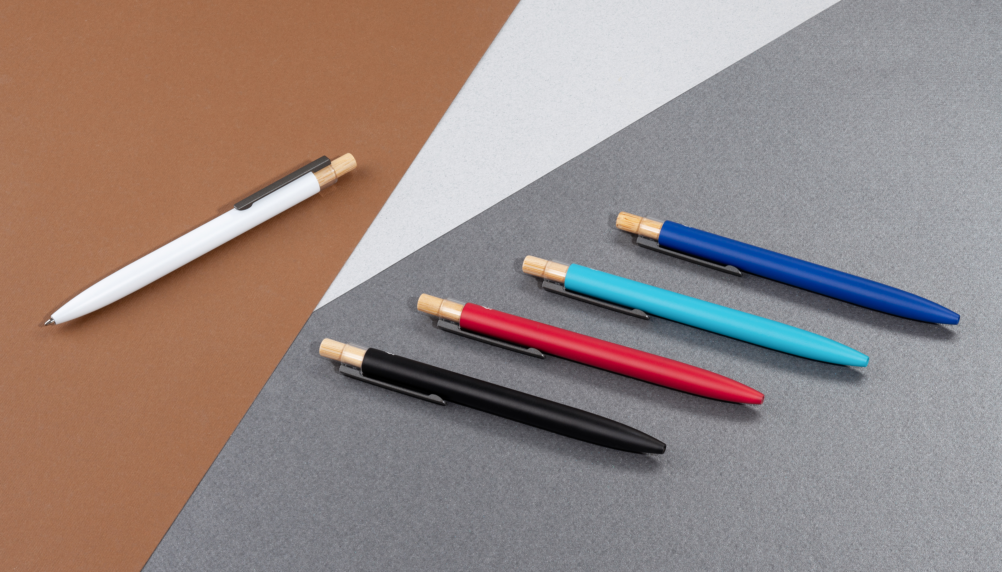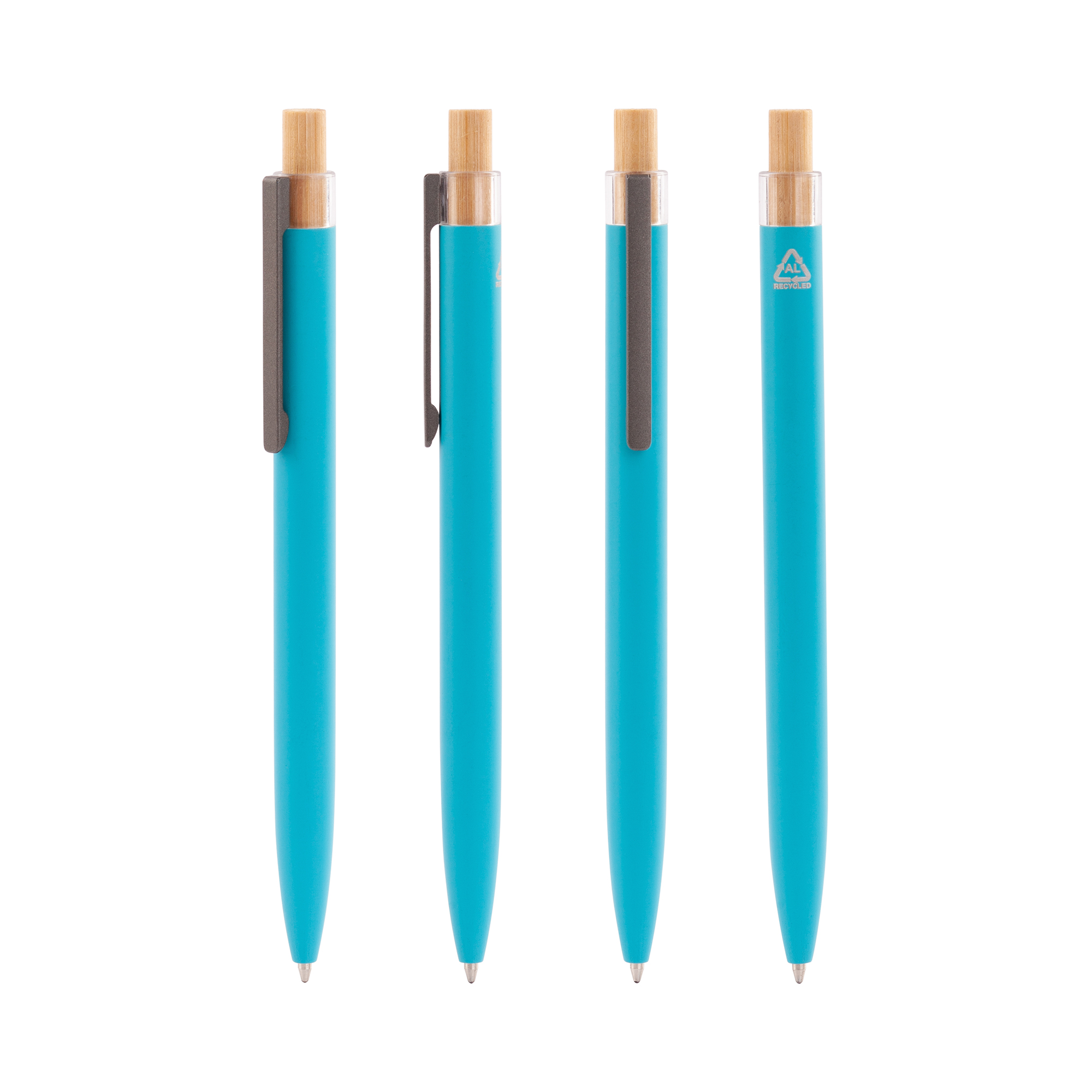 Трендовая эко-ручка, изготовленная из переработанных алюминия и пластика, с кнопкой из бамбука.