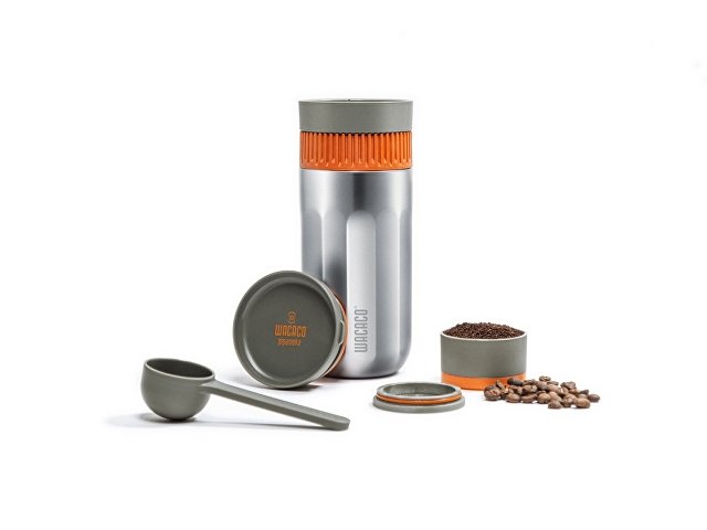В комплект входит: мягкая сумка-чехол, емкость для кофе 16г, мерная ложка для кофе 8г, крышка, кольцо управления, емкость для воды 300мл, воронка, кисточка для чистки.