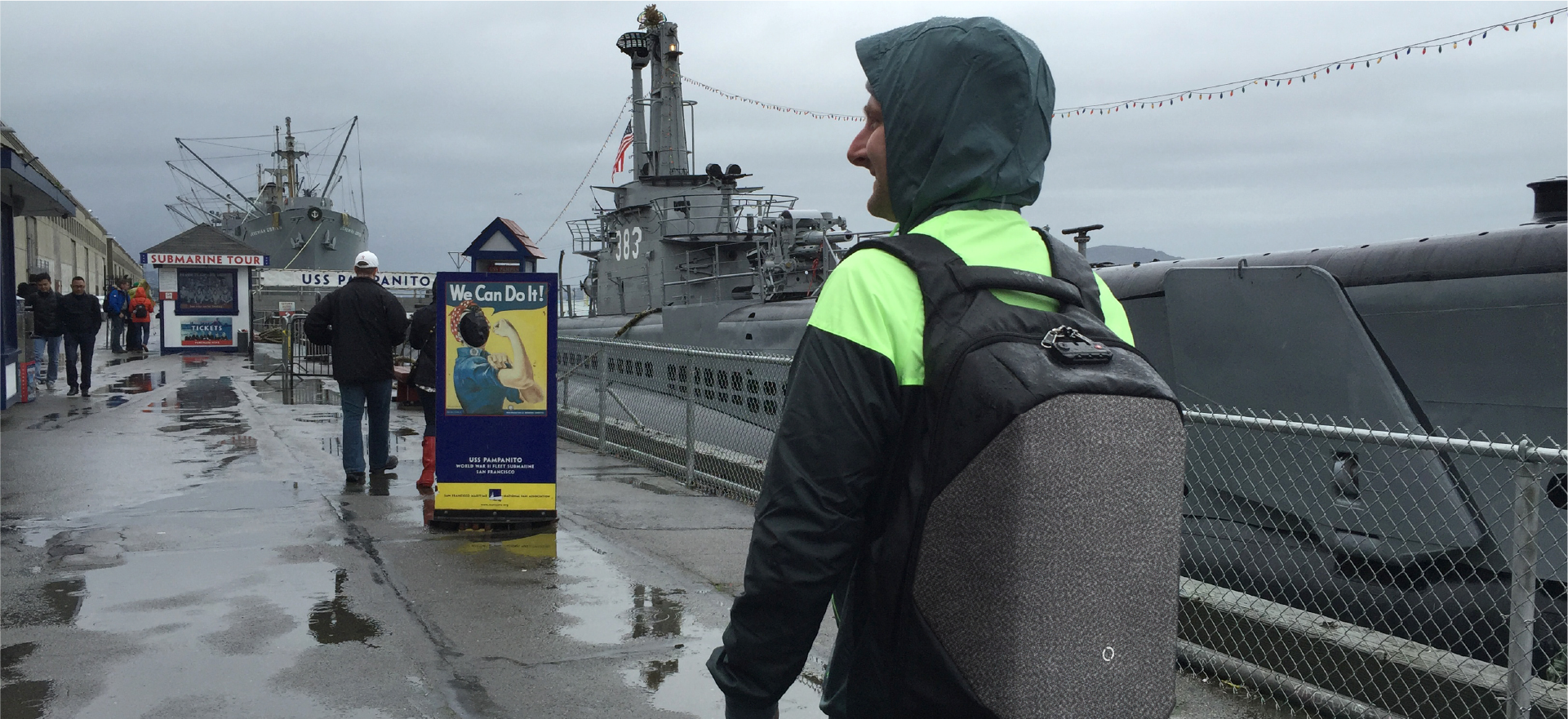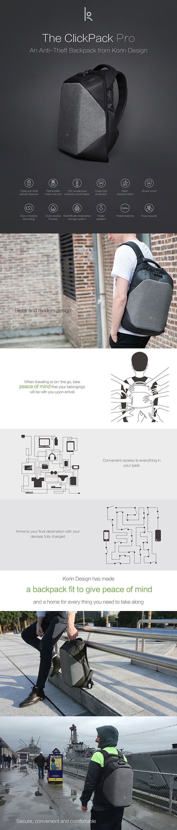 Вместительный рюкзак для путешественников ClickPack Pro из комбинации серого и черного цветов, обладатель премий Good Design Award 2017, Red Dot Design Award 2018, iF Design Award 2018, CMF Design Award, China Red Star Design Award, International Design Excellence Award, Upstyle Award 2018. Размер рюкзака 46х34х16 см, объем 17,3 л, вес 1310 гр. Сделан из высокопрочного устойчивого к порезам и трению водоотталкивающего материала многослойного плетения из разных типов ткани: нейлон, полиэстер и стекловолокно. Не требует специального ухода. Конструкция достаточно жесткая, не деформируется. Детально продуманная организация отделений позволяет грамотно распределить вес. Самые тяжелые предметы располагаются ближе к спине, например, в отделении размером 34х26х3 см для ноутбука диагональю до 15,6” и в кармане размером 19х25 см для планшета диагональю до 10”. Благодаря плотным перегородкам ноутбук и планшет надежно фиксируются и не перемещаются при ходьбе. Специальная анатомическая конструкция и вентилируемая мягкая спинка снижают нагрузку на плечи и спину, вес рюкзака воспринимается на 20-25% легче, чем при использовании стандартных моделей рюкзаков. Конструкция рюкзака позволяет раскрыть его на 180°, чтобы аккуратно уложить в рюкзак много различных предметов. Дополнительно в основном отделении расположены еще 9 карманов различного функционала. 7 открытых карманов под ручки и различные мелочи, 2 кармана на молниях размерами 8х18 см и 12х25 см, в который можно поместить powerbank, т к в него приходит USB-кабель (600 мм, 0,5-0,7 А, 5В), соединенный с портом на внешней стороне рюкзака для легкого подключения к смартфону. Это оригинальная запатентованная система зарядки K EasyCharging 1.0 с помощью USB-порта, расположенного в борту рюкзака, и кабеля, идущего к powerbank, что делает мобильную зарядку более удобной. В комплекте идут 2 органайзера для туалетных принадлежностей и электронных аксессуаров, которые можно зафиксировать внутри рюкзака на липучках, и специальный тканевый чехол с RFID-защитой размером 13х19,5 см. В сильный дождь на рюкзак можно одеть специальный непромокаемый чехол, который защитит его содержимое даже под ливнем или от брызг при поездке на велосипеде или мотоцикле. Рюкзак закрывается на молнию YKK, которую можно зафиксировать с помощью кодового замка TSA007 с функцией таможенного досмотра. Широкие и прочные лямки крепятся к небольшому тканевому борту, что позволяет рюкзаку как бы обхватывать вашу спину. В одном из бортов расположен USB-порт, а в другом - чехол для зонта или бутылки с водой, который при использовании фиксируется специальным креплением. На правой лямке рюкзака находится easy access карман размером 12х6 см на молнии, на левой - открытый карман 10х5 см. На внешней стороне рюкзака в стыке серого и черного цветов спрятался треугольный карман на молнии размером 16х9 см с застежкой фастекс для ключей, которая позволяет вам легко отстегнуть/пристегнуть ключи. На спинке рюкзака расположен внешний потайной карман размером 15х29 см на молнии. Для его защиты достаточно того, что он вплотную прилегает к вашей спине и вытащить что-то из него без снятия рюкзака невозможно. В дополнение к вышеперечисленным средствам защиты рюкзак ClickPack Pro оснащен стальным тросом, которым можно обхватить неподвижный предмет и затем зафиксировать в кодовом замке. Сверху расположена ручка из полиуретана, за которую при необходимости удобно нести рюкзак в руках или закрепить 