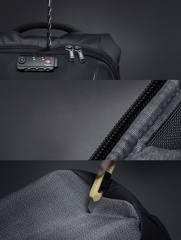 - Рюкзак закрывается на водонепроницаемую молнию YKK, которую можно зафиксировать с помощью кодового замка TSA с функцией таможенного досмотра