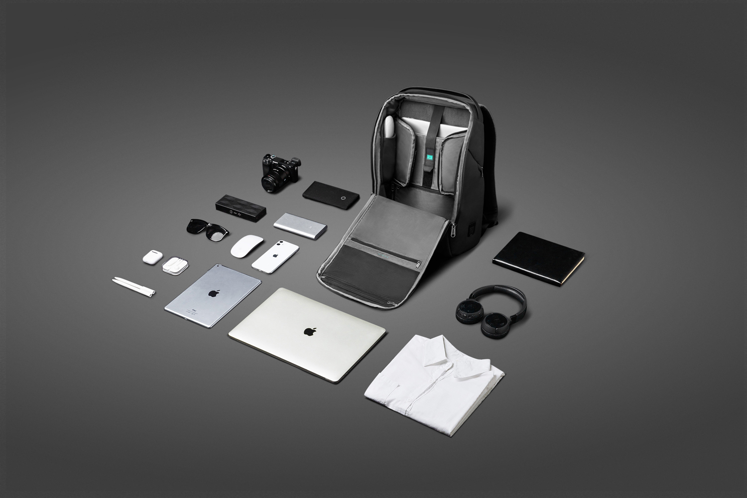 Вместительный водозащищенный рюкзак FlexPack Pro, обладатель премий iF Design Award 2019, Golden Pin Design Award, China Outstanding Industrial Design (CEID) Award, Governor Cup Industrial Design Excellence Award. Сделан из комбинации высокопрочных устойчивого к порезам и трению водоотталкивающих материалов: полиэстера и ткани многослойного плетения разных типов (нейлон, полиэстер и стекловолокно) черного и темно-серого цветов. Не требует специального ухода. Размер рюкзака 47х34х18 см, объем 18 л, вес 1330 гр. Рюкзак закрывается на водонепроницаемую молнию, которую можно зафиксировать с помощью кодового замка TSA007 с функцией таможенного досмотра. Конструкция рюкзака достаточно жесткая, не деформируется. Внутри рюкзака есть специальный карман, в который можно поместить powerbank, т к в него приходит USB-кабель (600 мм, 0,5-0,7 А, 5В), соединенный с портом на внешней стороне рюкзака для легкого подключения к смартфону. Это оригинальная запатентованная система зарядки K EasyCharging 1.0 с помощью USB-порта, расположенного в борту рюкзака, и кабеля, идущего к powerbank, что делает мобильную зарядку более удобной. По бокам рюкзака расположены 2 easy access кармана размером 22х12 см на водонепроницаемых молниях для термокружки, бутылки с водой, зонта, смартфона или других относительно небольших предметов. Детально продуманная организация отделений позволяет грамотно распределить вес. Самые тяжелые предметы располагаются ближе к спине, например, в отделении с мягким покрытием для ноутбука диагональю до 15,6”. Ноутбук надежно фиксируется и не перемещается при ходьбе. Внутри рюкзака есть 5 дополнительных карманов на молниях: 3 кармана 15-17х21-26 см и 2 боковых кармана с отделениями для телефона и мелочей 11,5х20 см. Специальная анатомическая конструкция вентилируемых мягких спинки и лямок и дополнительная поперечная лямка на магнитной застежке снижает нагрузку на плечи и спину, вес рюкзака воспринимается на 20-25% легче, чем при использовании стандартных моделей рюкзаков. На лямке специальная петля для очков или наушников. Сверху рюкзака есть удобная ручка из высококачественной прочной резины, за которую его можно нести или зафиксировать на ручке чемодана. Рюкзак оснащен стальным тросом, которым можно обхватить неподвижный предмет и затем зафиксировать в кодовом замке.