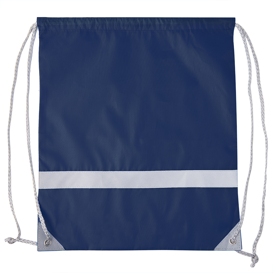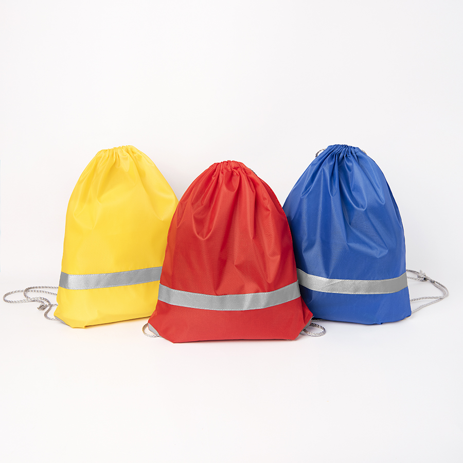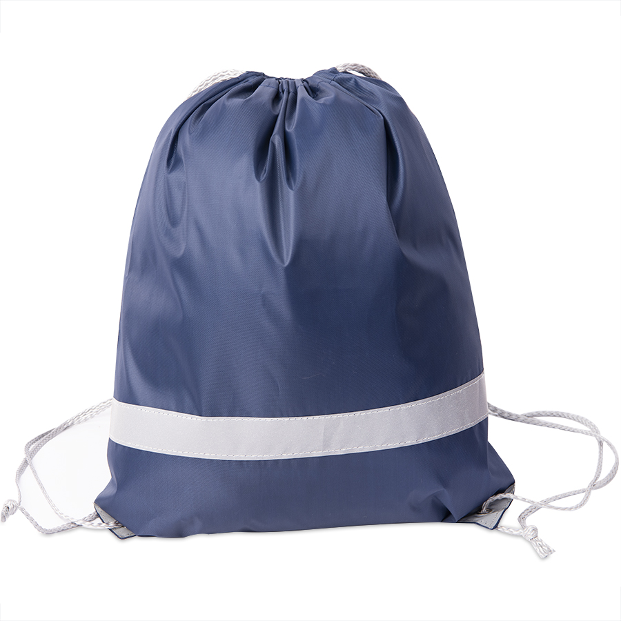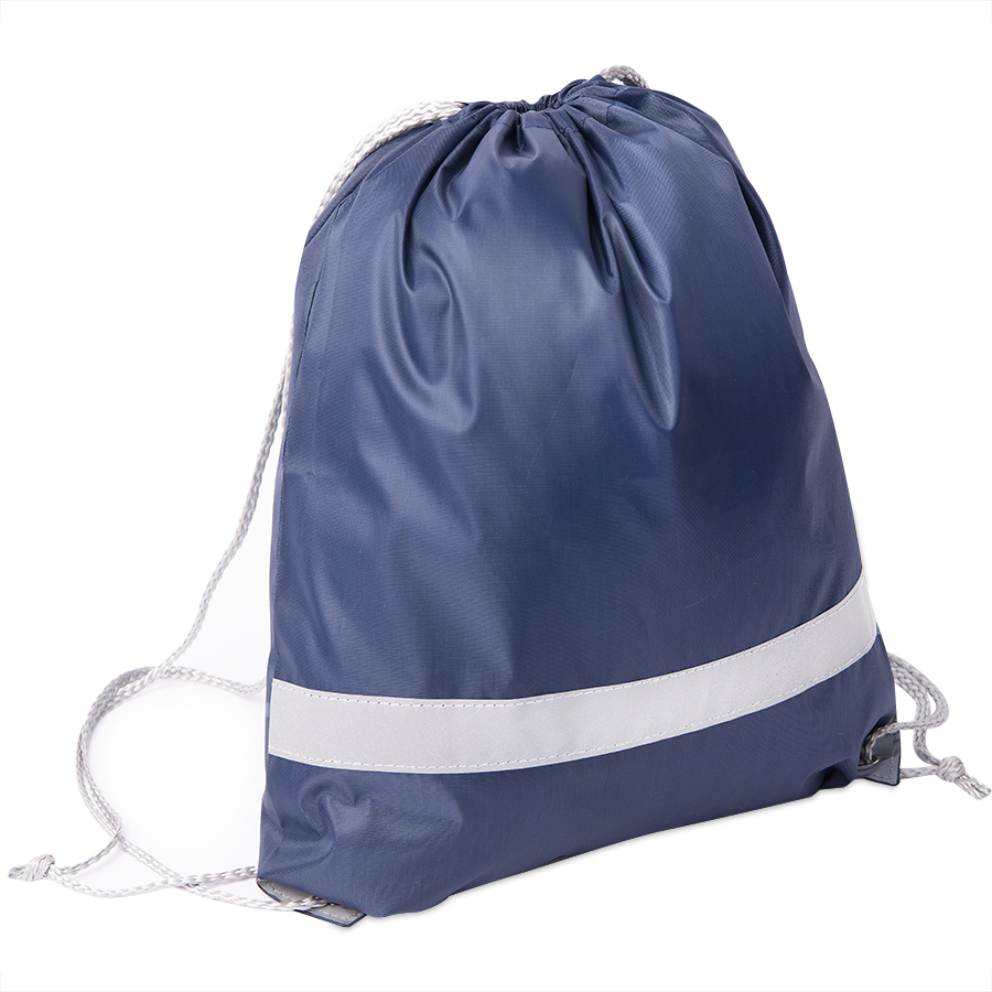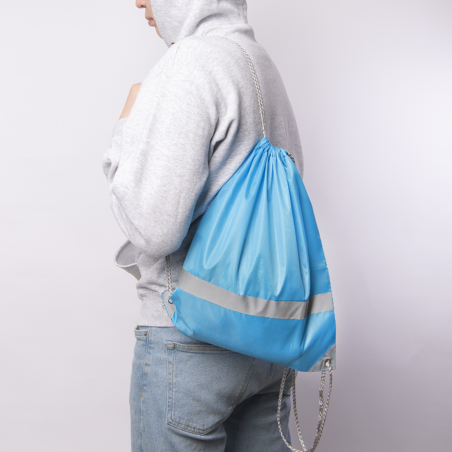Рюкзак-мешок RAY из полиэстера 210Dсо светоотражающей полосой спереди, светоотражающими уголками,усиленными металлическими люверсамиЛегко и просто затягивается по верхней части серыми шнурами.