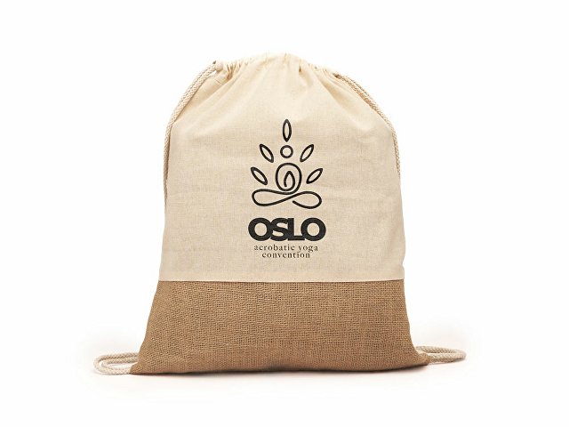 Рюкзак-мешок Eco line из хлопка и джута плотностью 120 г/м². Натуральный цвет. Спереди рюкзак имеет джутовую ленту на нижней части.