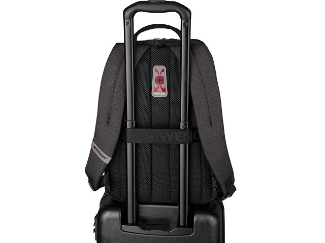 - Рукав для крепления к чемодану позволяет зафиксировать рюкзак на телескопической ручке чемодана для удобного перемещения нескольких предметов багажа одновременно.