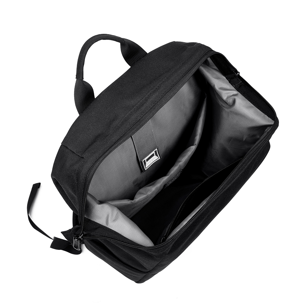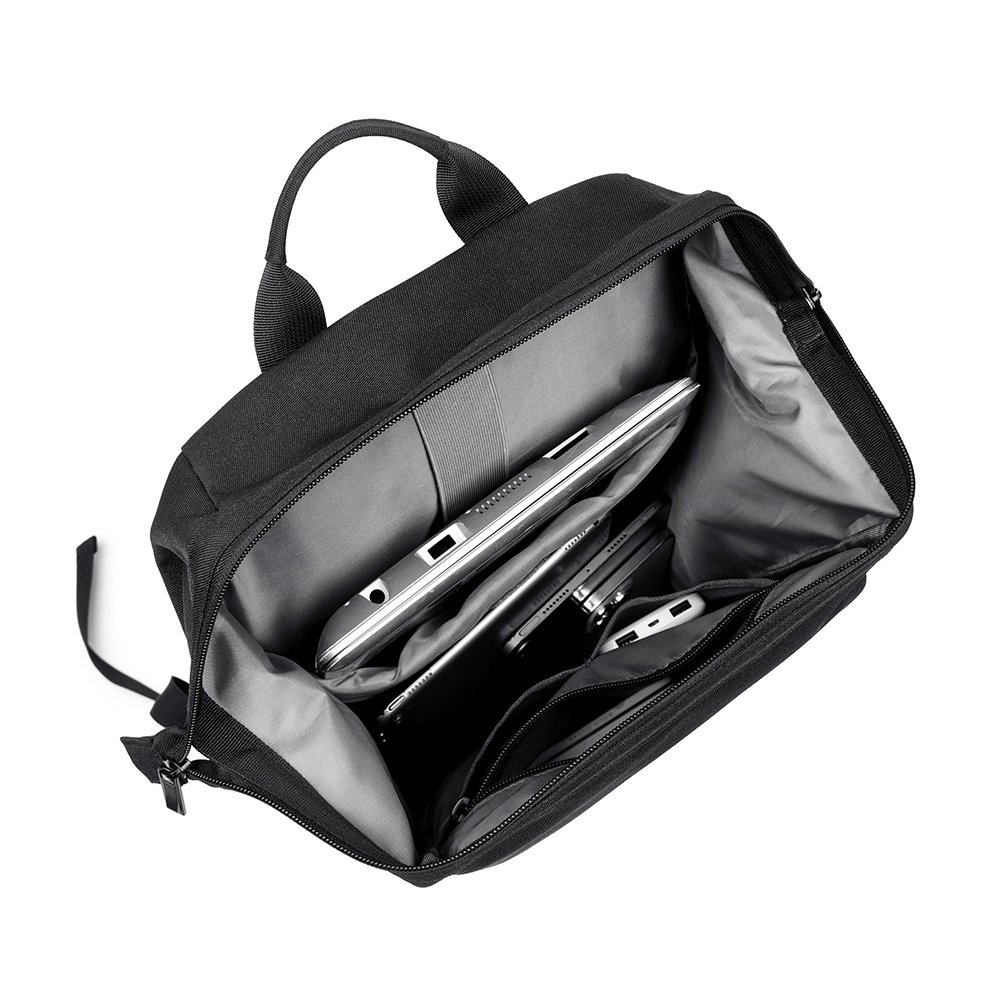 Его особенности - жесткие фиксаторы верхнего края придающие форму "а-ля саквояж", элегантный внешний вид и обеспечивающие отличный доступ в рюкзак. Основное отделение закрывается на молнию с двумя пуллерами.