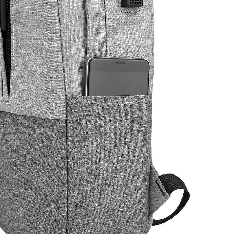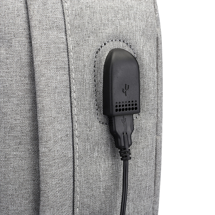 На передней стенке два кармана карман на скрытых молниях. Сбоку два открытых кармана и USB-разъем с проводом для подключения внешнего аккумулятора.