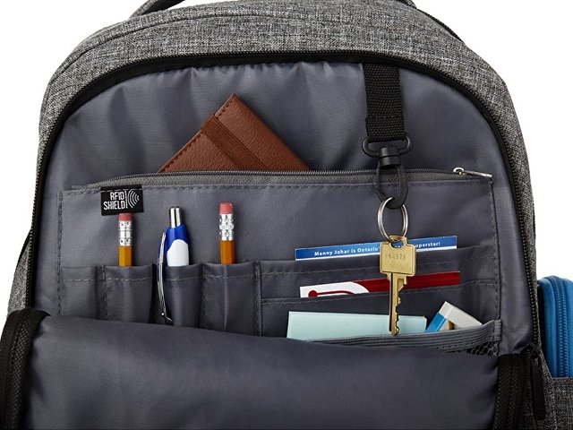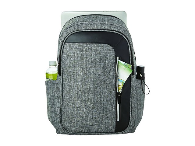 Рюкзак Vault для ноутбука 15.6 с защитой RFID. Изящный, современный рюкзак для ноутбука 15,6 с большим передним карманом на молнии с карабином для ключей, и скрытым карманом с защитой RFID, чтобы защитить ваши карточки и паспорт от кражи личных данных. Большое основное отделение вмещает ноутбук 15,6 и специальный карман для IPad или планшета. Плотная спинка. Передняя вертикальная молния разработана, чтобы дать вам быстрый доступ к переднему карману. 2 дополнительных боковых кармана для большего места, регулируемые, мягкие ремни рюкзака позволят прикрепить к ним дополнительные аксессуары. Ручка вверху и стропа для крепления к чемодану. 600D полиэстер с акцентами из ПУ винила. Термотрансфер (1 цвет (цветные изделия)) на данный товар осуществляется бесплатно. Оплачивается только настройка оборудования в размере 10000 рублей на весь тираж.