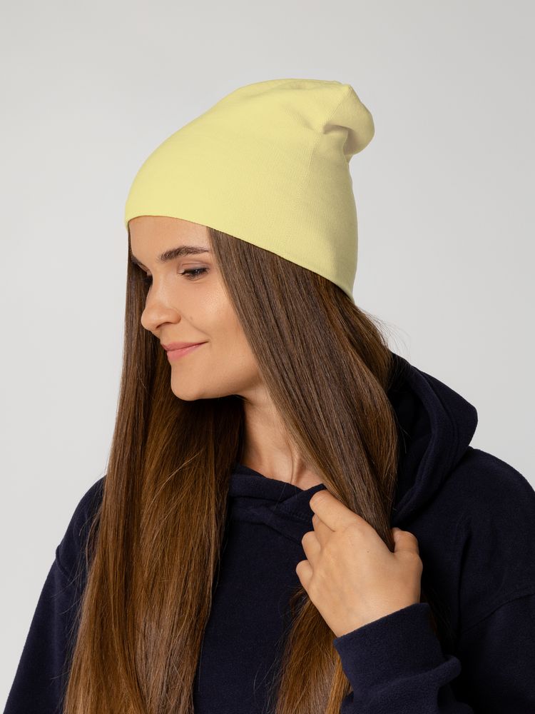 Двухслойная шапка-бини тонкой вязки, которую можно носить как с подворотом, так и без.
