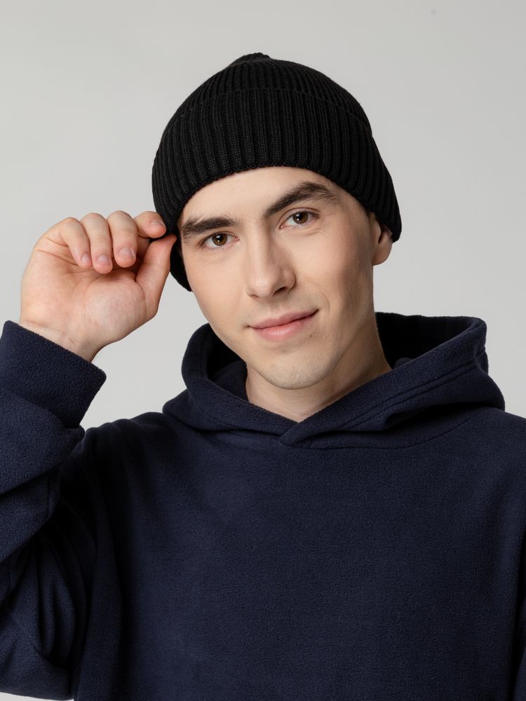 Однослойная шапка из высокообъемной пряжи с отворотом.
