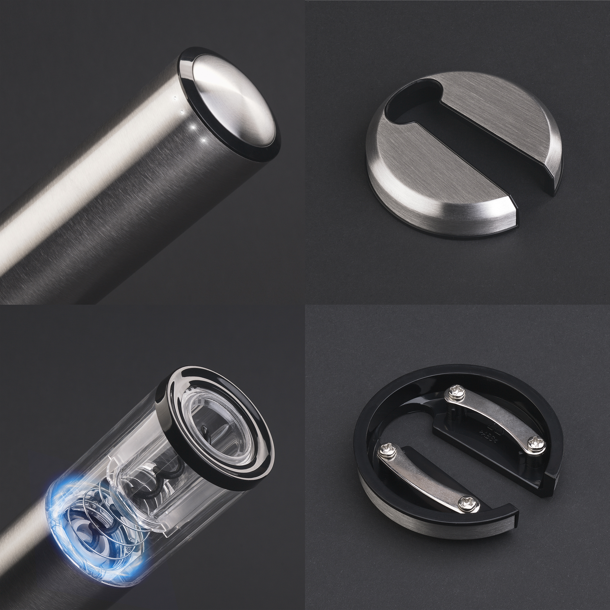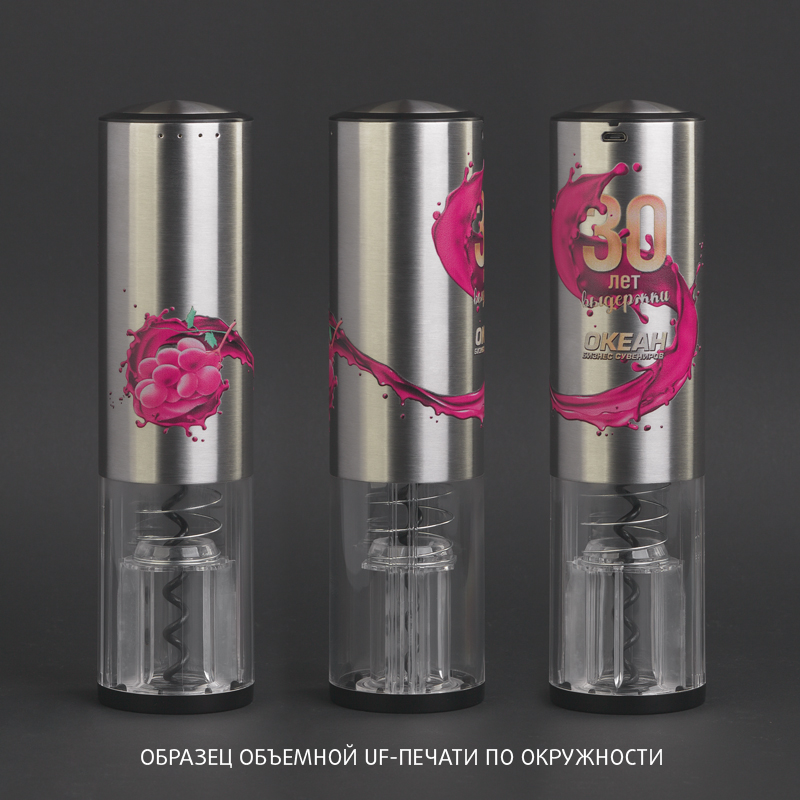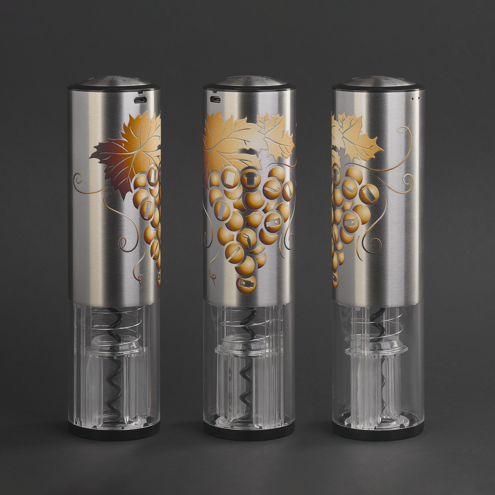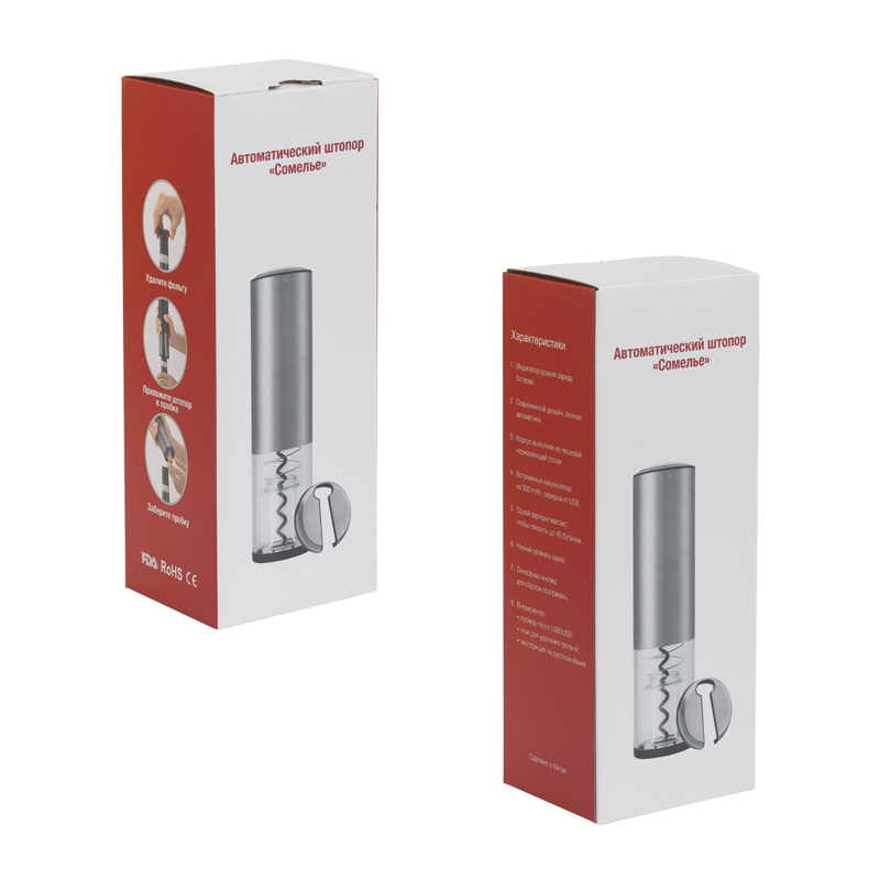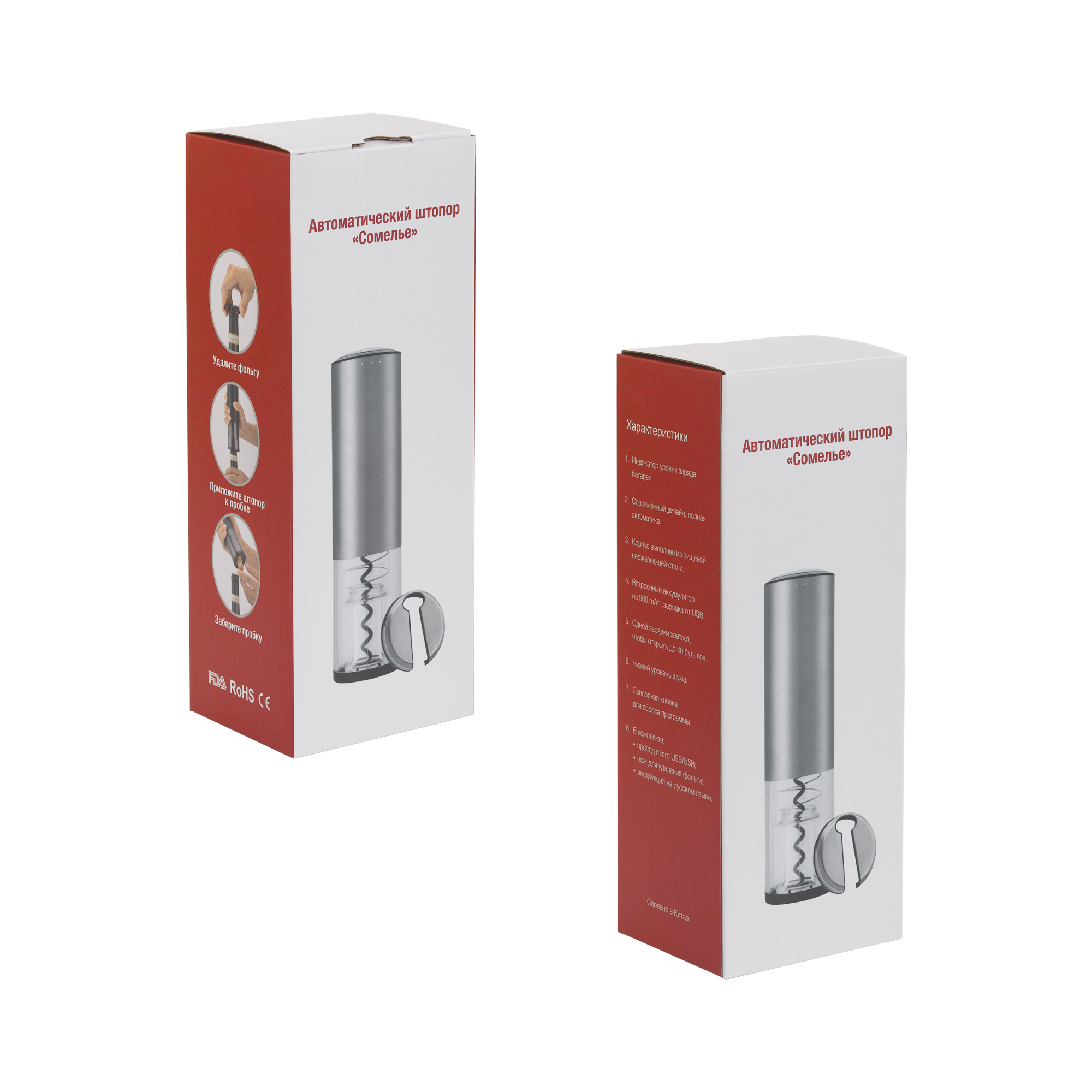 Штопор «Сомелье» простой в использовании — поместите его по центру пробки на горлышко бутылки, затем, с помощью легкого нажатия, извлеките пробку. Элегантный девайс имеет подсветку, что добавляет ещё больше антуража при открытии бутылки. Кроме этого, он не требует частой подзарядки — одного заряда хватает на открытие минимум 40 бутылок!
