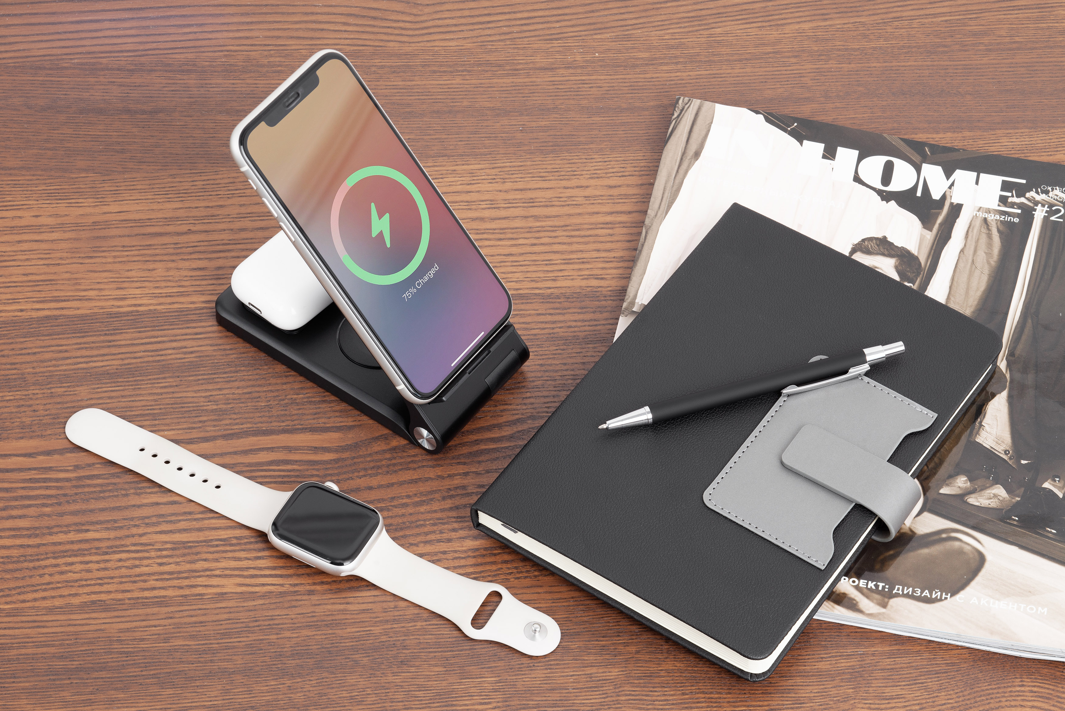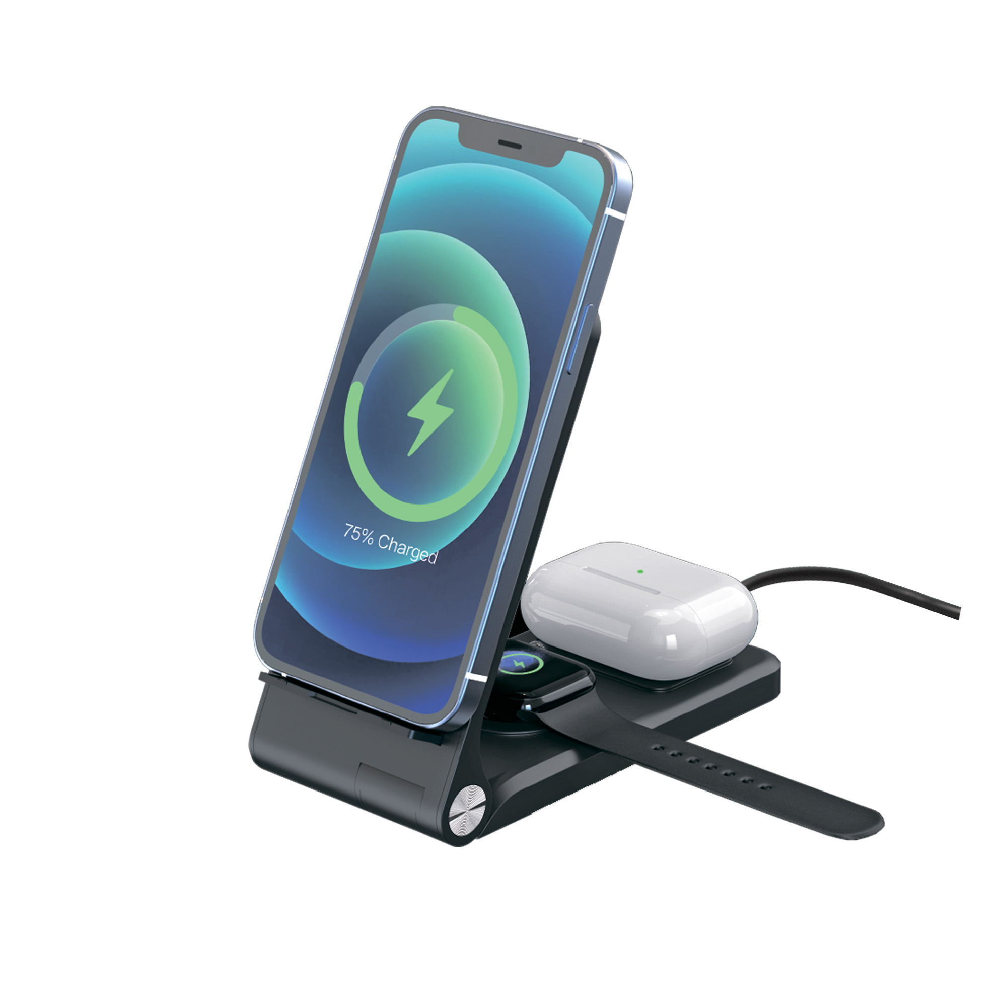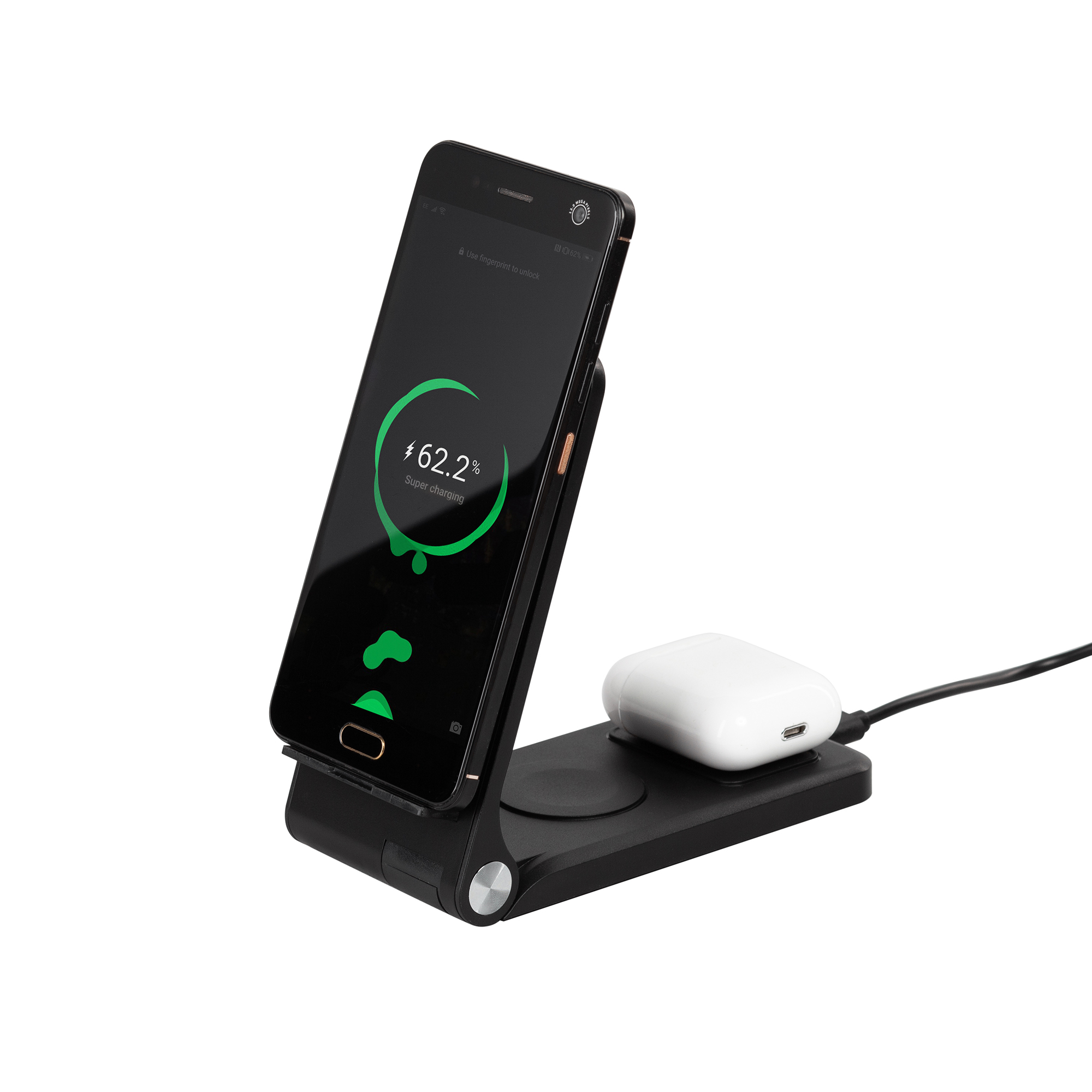 Универсальная 3 в 1 быстрая зарядная станция для всех персональных гаджетов - смартфона, смартчасов и наушников. Смартфон может быстро заряжаться как в вертикальном, так и в горизонтальном положении благодаря сразу двум встроенным в корпус зарядным кольцам-катушкам (оба по 15W).