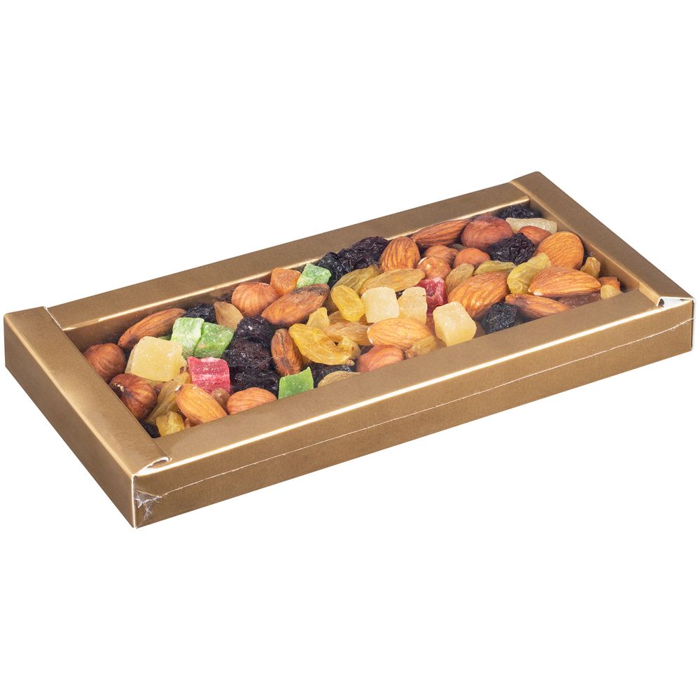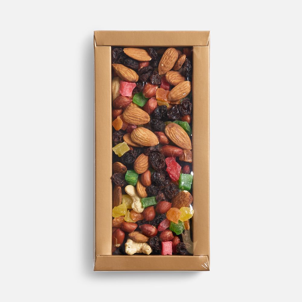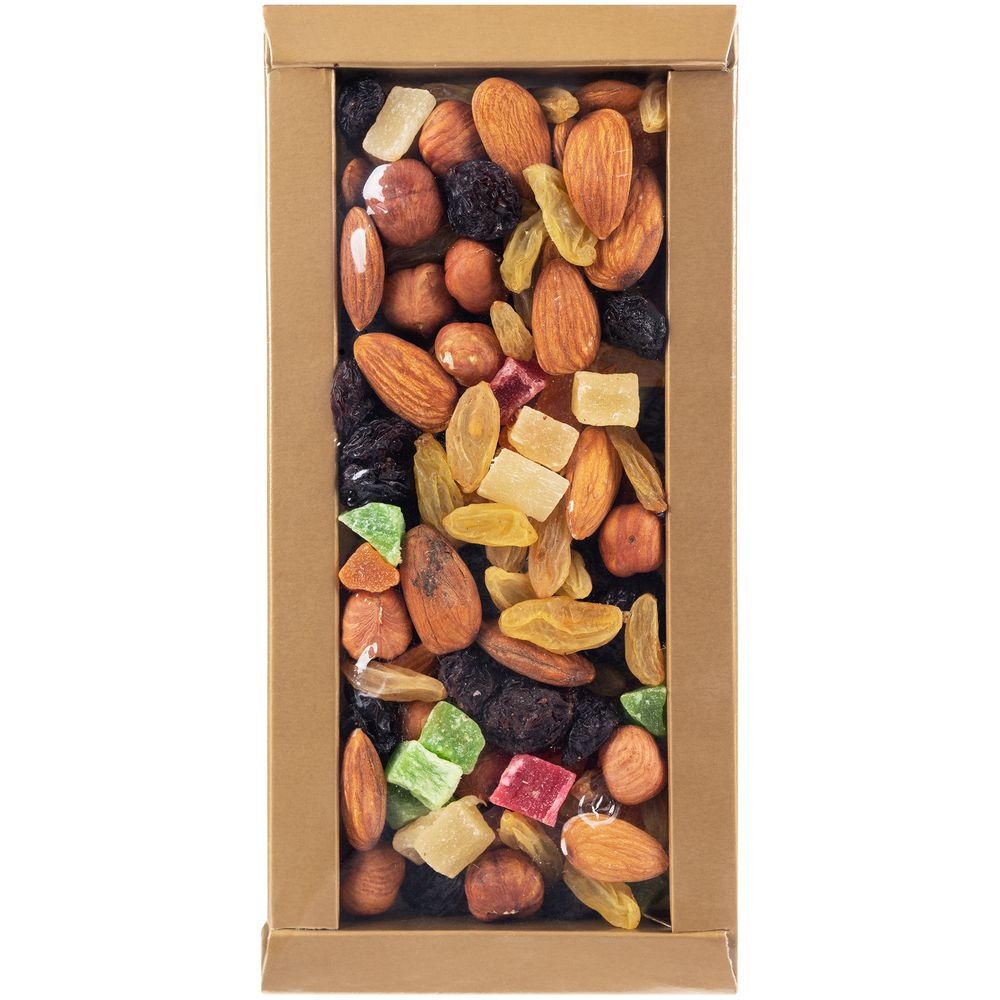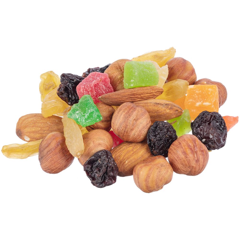 Состав: миндаль, фундук, изюм «Джамбо» черный, изюм «Голден», цукаты из ананаса.