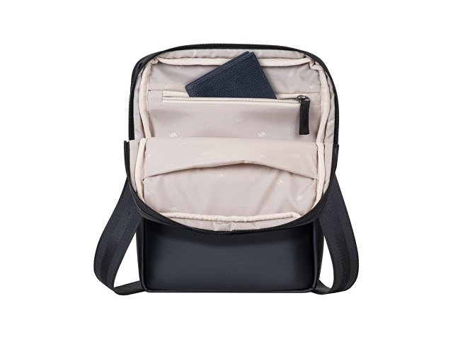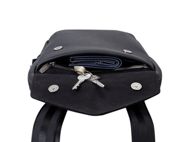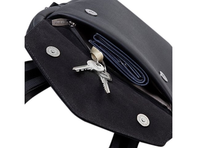 • Передний карман на молнии оборудован панелью-органайзером для хранения визитных карт, авторучек и съемным карабином для ключей.