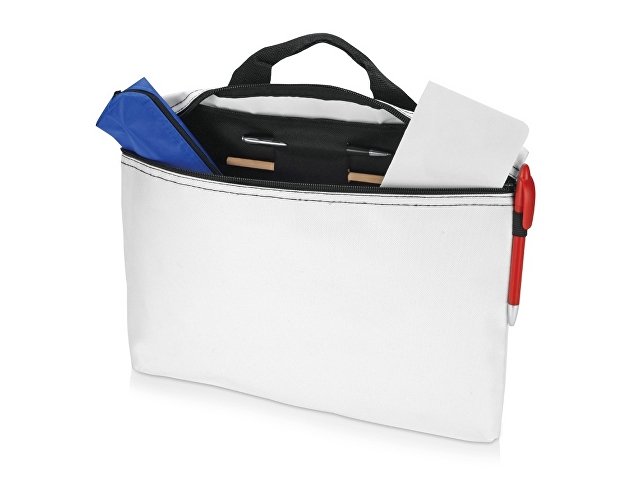 Сумка для конференций с ручкой, застежкой на молнии и держателями для ручек снаружи и внутри сумки. Подходит для документов формата А4. Трафаретная печать (1 цвет (цветные изделия)) на данный товар осуществляется бесплатно. Оплачивается только настройка оборудования в размере 10000 рублей на весь тираж.