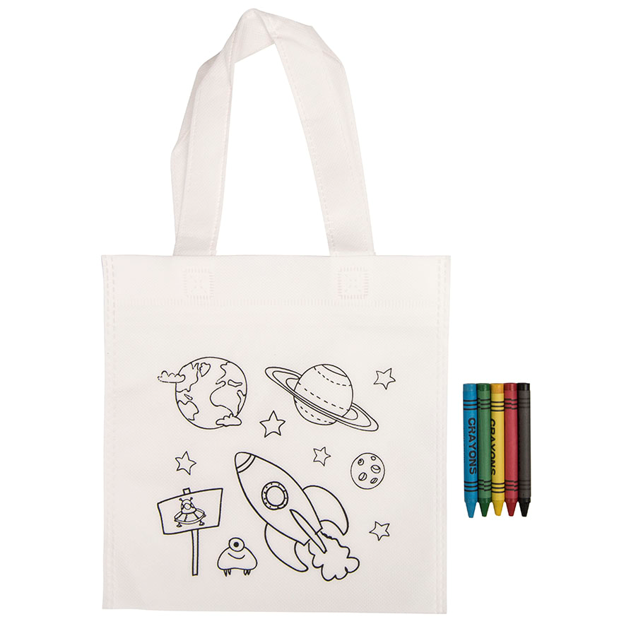 Сумка из нетканого материала белого цвета, специально разработанный для раскрашивания мелками. В набор входят 5 цветных мелков: синий, красный, желтый, зеленый, черный.