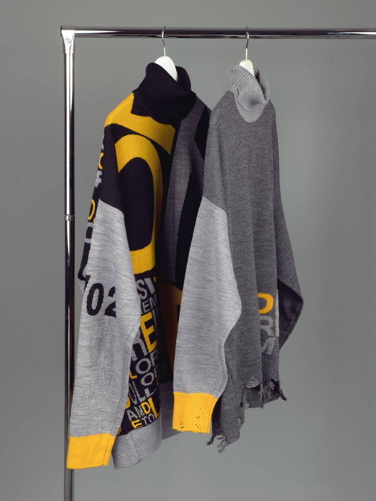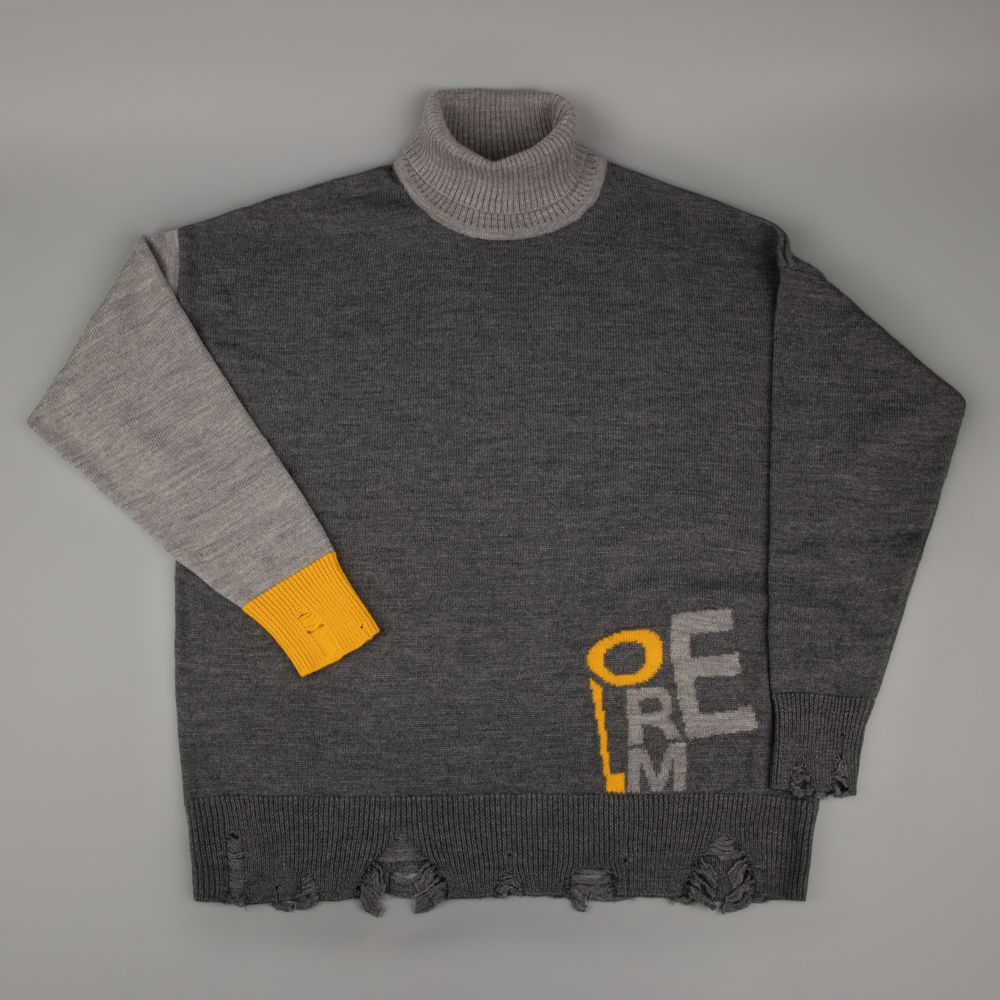 Модель: однотонный гладкий свитер унисекс, спущенное плечо. Ворот, манжеты и низ изделия вывязаны резинкой c добавлением эффекта «рваного» края.