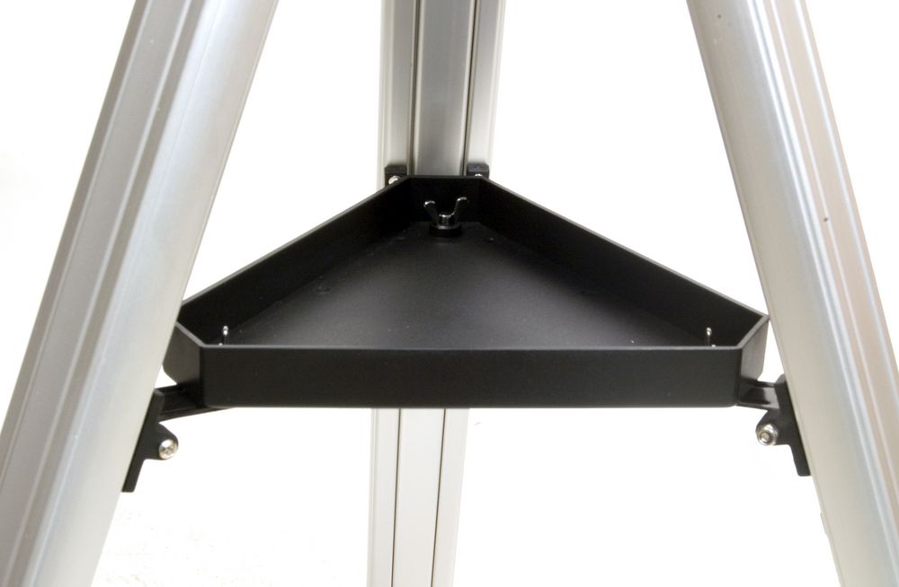 Линзовые поверхности телескопа имеют просветляющее покрытие, которое обеспечивает максимальное светопропускание, а отражающие — защитный слой, увеличивающий срок их службы. Очень компактная и легкая алюминиевая труба установлена на устойчивую экваториальную монтировку, оснащенную ручками тонких движений и допускающую установку электропривода часовой оси. Такая монтировка имеет специальные координатные круги, с помощью которых, после несложной настройки, можно находить объекты по их экваториальным небесным координатам, а также сопровождать суточное движение объекта вращением только одной ручки. Тренога регулируется по высоте и имеет удобную полочку для принадлежностей. На выходной втулке имеется стандартная Т-резьба, которая, через дополнительное переходное кольцо, позволяет присоединять к телескопу зеркальную фотокамеру и производить съемку Луны и других ярких объектов.В комплект входит лоток для аксессуаров, крепящийся на треногу.