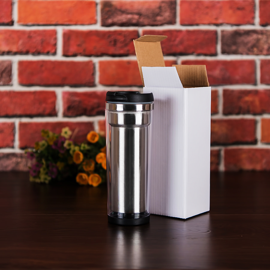 Термокружка с колбой из нержавеющей стали с огромным полем для печати, на котором можно разместить не просто логотип, а целый буклет. Полноцветная вставка занимает всю поверхность стакана и смотрится очень органично. Для сборки и разборки не требуются клей или специальные инструменты - изображение помещают в пространство между внешним и внутренним слоями корпуса. Хранит тепло 2-3 часа.