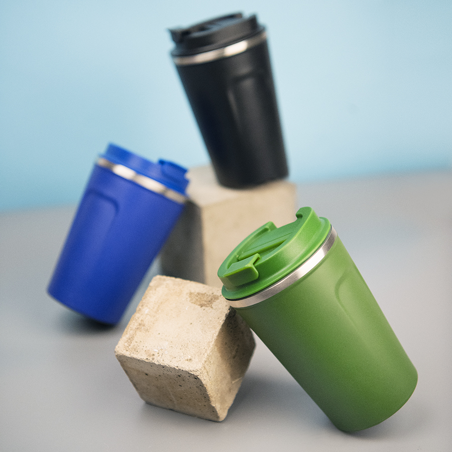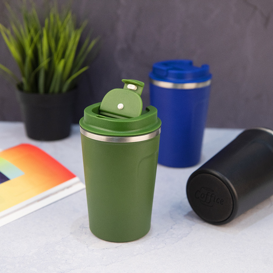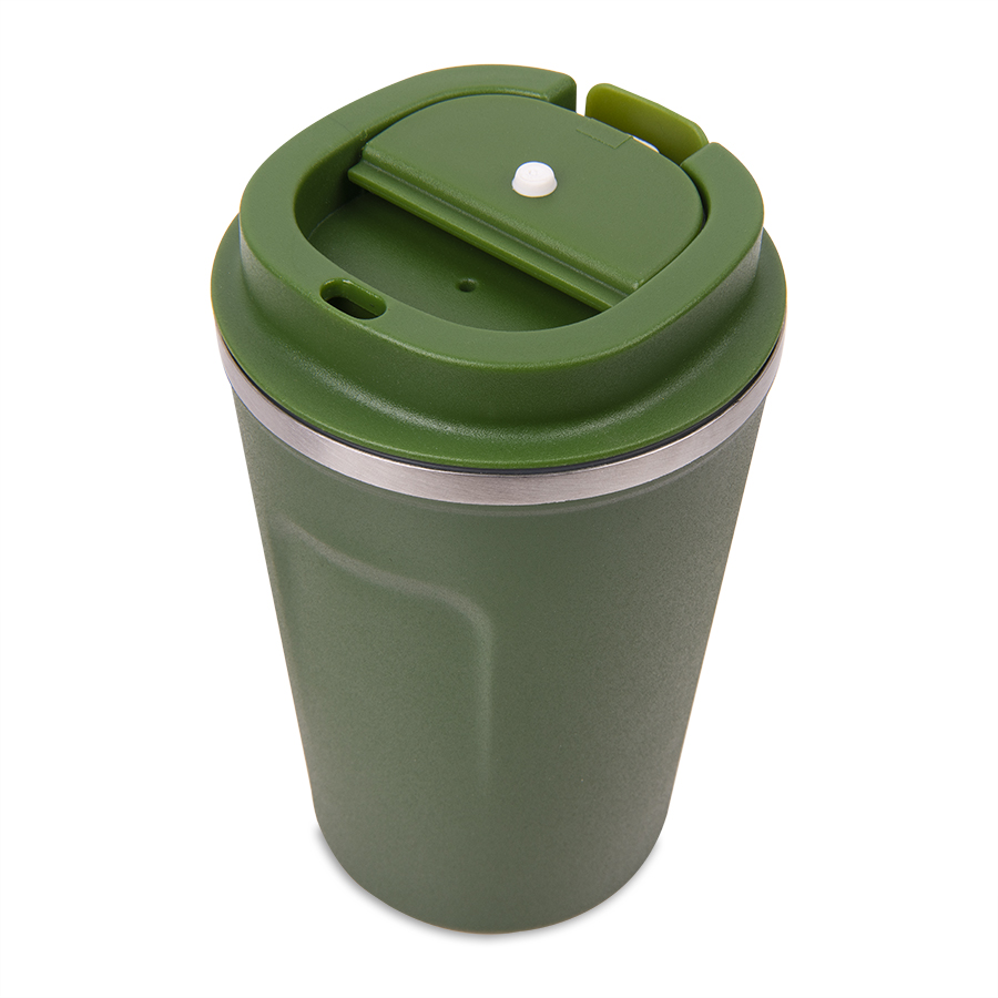Термокружка-непроливайка с двойными стенками с откидным клапаном для питьяКолба и корпус из нержавеющей стали.Матовая микрорельефная фактура корпуса достигается благодаря особому покрытию - powder coatingЭто специальное порошковое окрашивание, более прочное и долговечное Сохраняет температуру напитков до 3-4 часов.Индивидуальная упаковка - коробка из крафтового картона